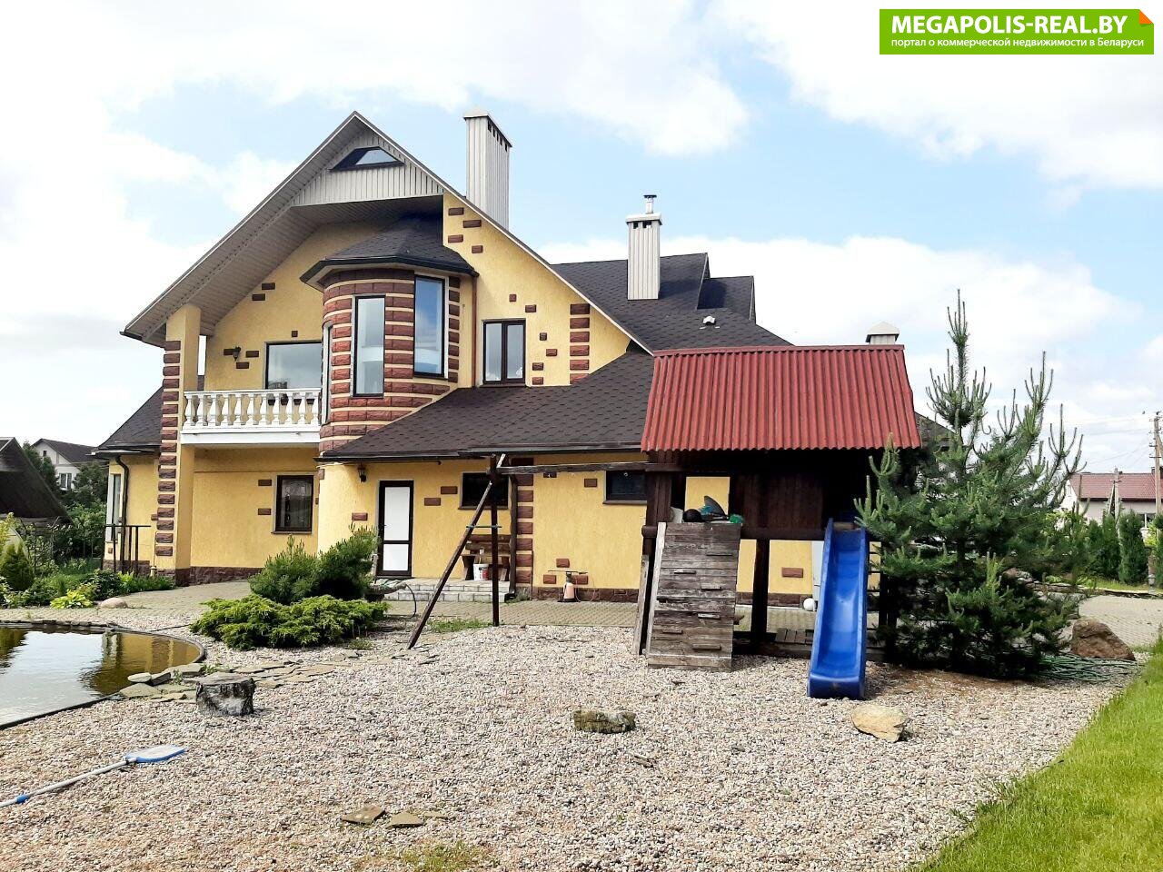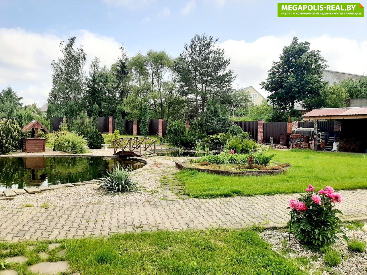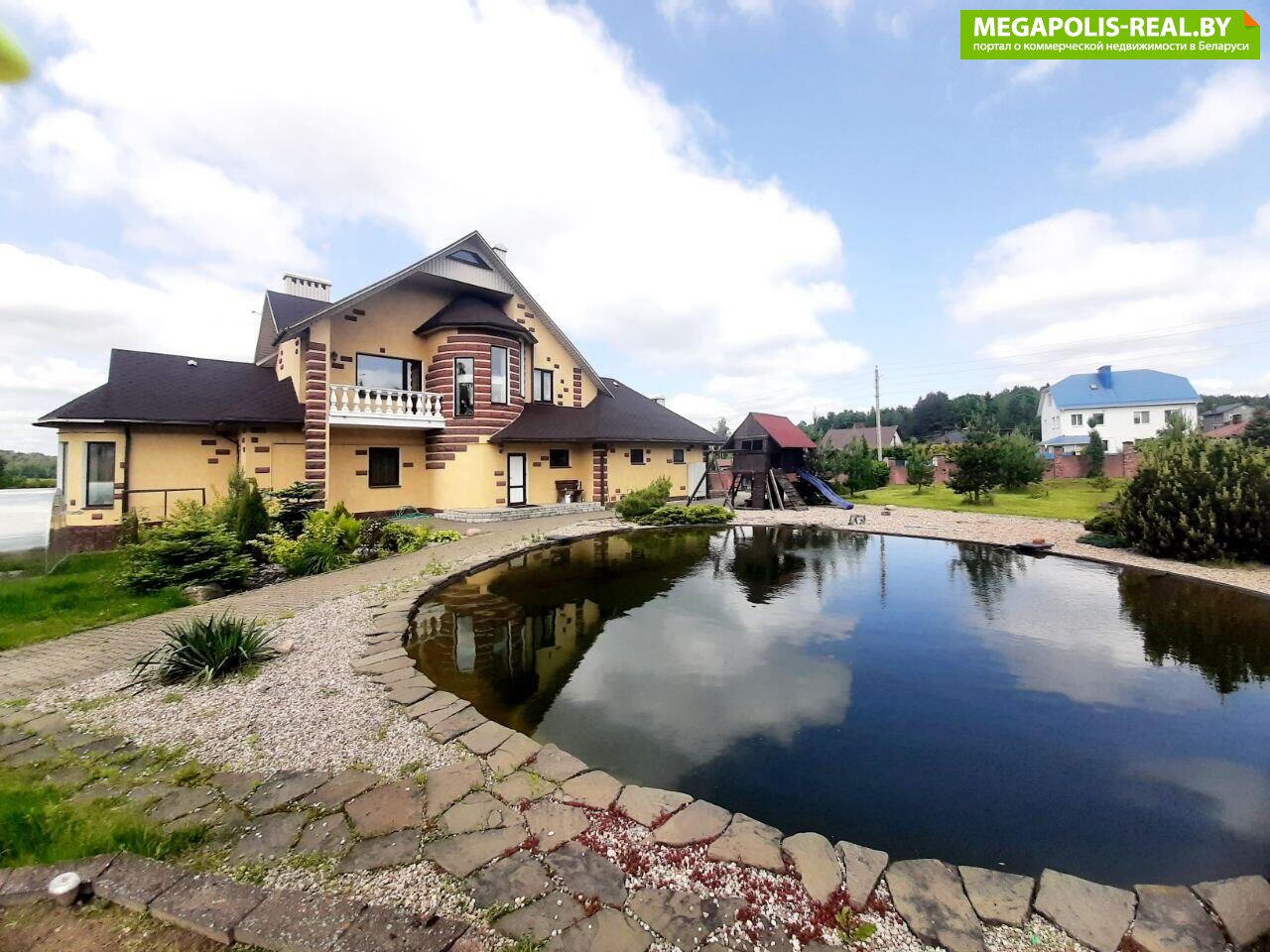 Обустроенная придомовая территория. Ландшафтный дизайн, газон, водоем с рыбками, мощеные дорожки. Бассейн. Детская площадка. Хоз. постройки. Зона барбекю из кирпича+ мангал. Ворота с электроприводом. Гостевая парковка. Плодово- ягодные насаждения. Огород. Теплица.