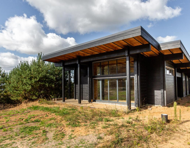 Готовность дома 50%. При строительстве заливался монолитный фундамент, стены изготовлены по финской технологии из клееного бруса, фальцевая кровля.