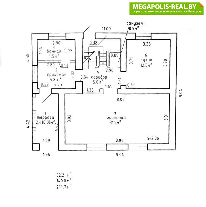 (1 этаж – терраса, прихожая, коридор, гостиная 32 кв.м., кухня 12.3 кв.м., ванная, санузел;
