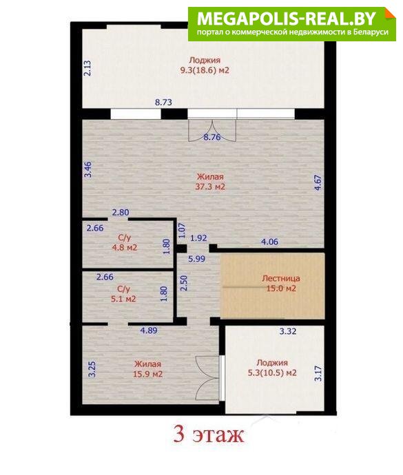 3 этаж: две комнаты, лоджия, гардеробная, санузел .