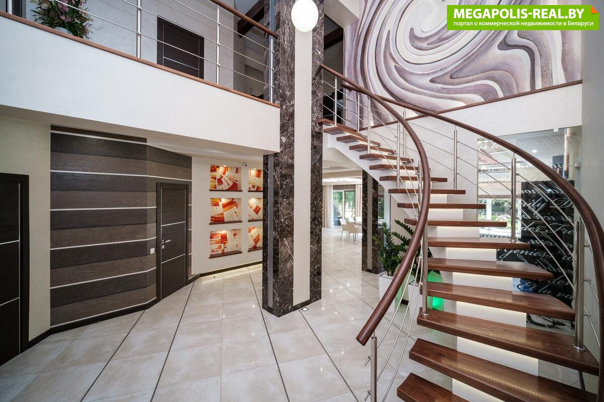 - первый этаж площадью 191.9м2: прихожая, просторная кухня-гостиная с панорамными окнами, с видом на пруд и выходом на открытую террасу, гостевая спальная, кабинет-библиотека, постирочная, санузел, гараж на 2 машина-места;