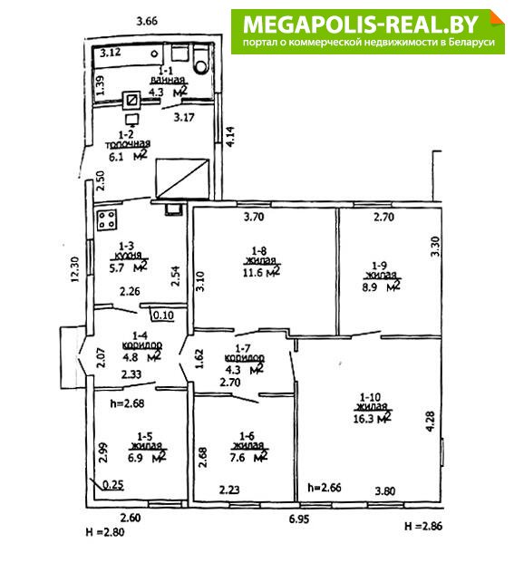Полдома состоит из пяти жилых комнат (три комнаты изолированные), кухни и санузла.