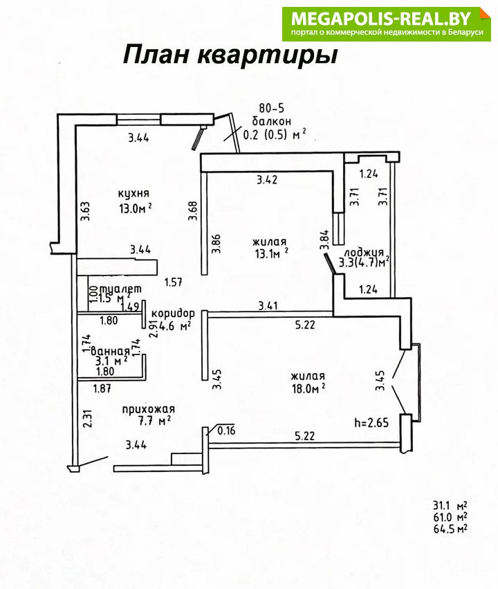 Общая площадь без учета лоджии и балкона – 61 м².