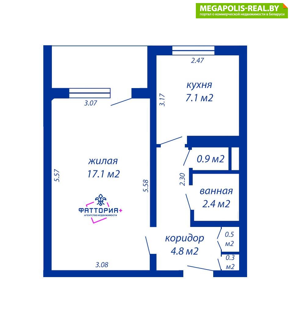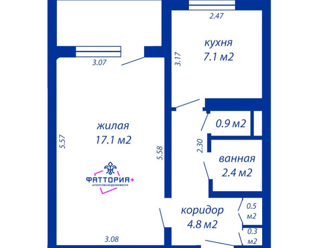 Просторная комната 17,1м., кухня 7,1м, раздельный санузел, застекленная лоджия.