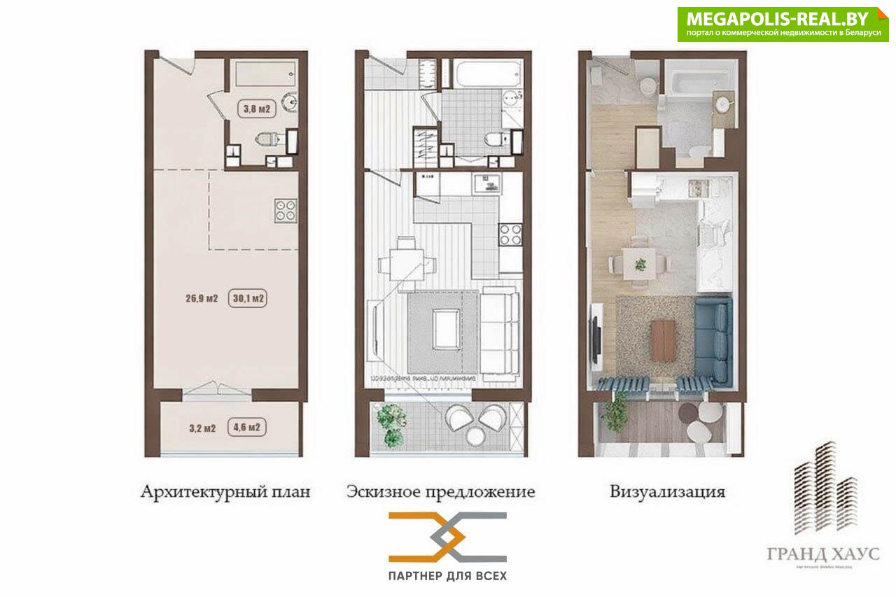 Свободная планировка включает в себя: гостиную с зоной кухни - 23,1 м2, ванную комнату - 3,8 м2., лоджию - 4,6 м2. Высота потолков - 2,7м. Лоджия застеклена стеклопакетами пр-ва ReHAU. В доме установлены два лифта — пассажирский и грузовой. Современные и тихие лифты OTIS. В общем тамбуре установлена дверь с кодовым замком. Видеонаблюдение. Дворовая территория огорожена, въезд ч/з шлагбаум. Дом в ведении тов-ва собственников. Прямо во дворе дома расположен Грушевский сквер с зелёной зоной и тренажёрами — отличное место для прогулок и отдыха. В шаговой доступности: магазины, школа, сады, аптеки, спорт комплекс, кафе и др.., что позволяет экономить время на повседневный досуг. Чистая продажа, никто не прописан. ООО «Партнер для всех», УНП 690665135, лицензия Министерства юстиции Республики Беларусь № 02240/321 от 02.12.2016, договор на оказание риэлтерских услуг № 38/7 от 18.03.2026
