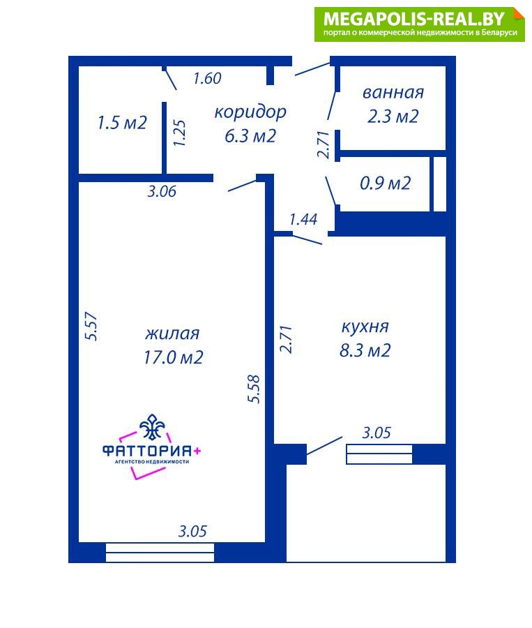 СНБ - 38,0 м2 / общая 36,3 м2 / жилая - 17,0 м2 / кухня - 8,3 м2