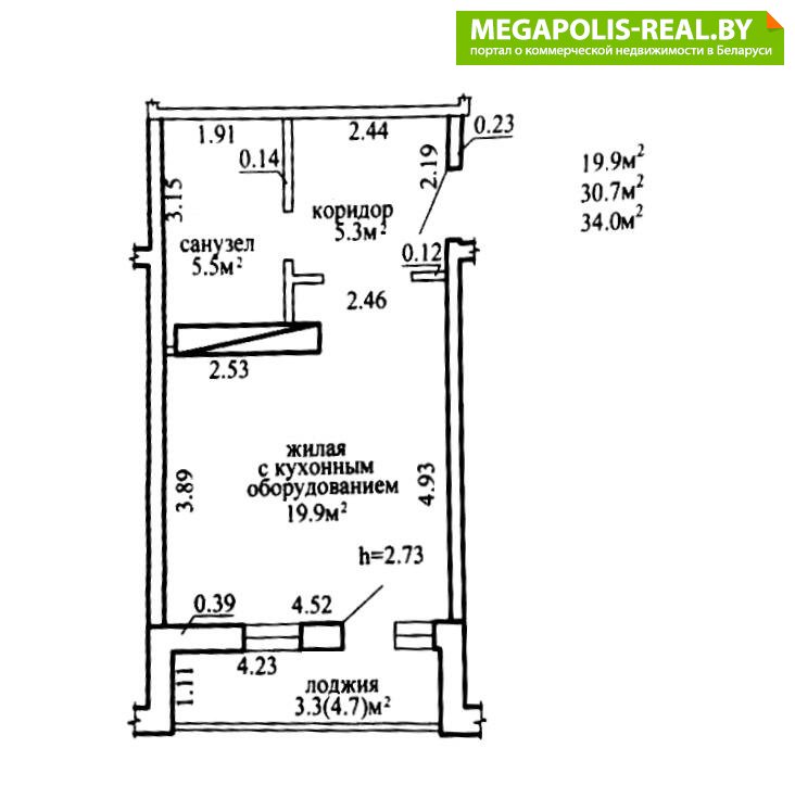 Высота потолка – 2,73 м