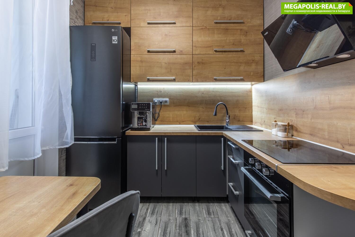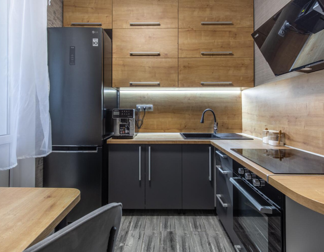 Встроенная техника именитых производителей. Индукционная варочная поверхность. Мойка из искусственного камня. Удобный гибкий смеситель.