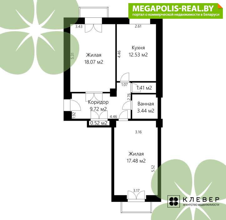 Просторные комнаты на разные стороны света -- 17,43 м2 и 18,07 м2.
