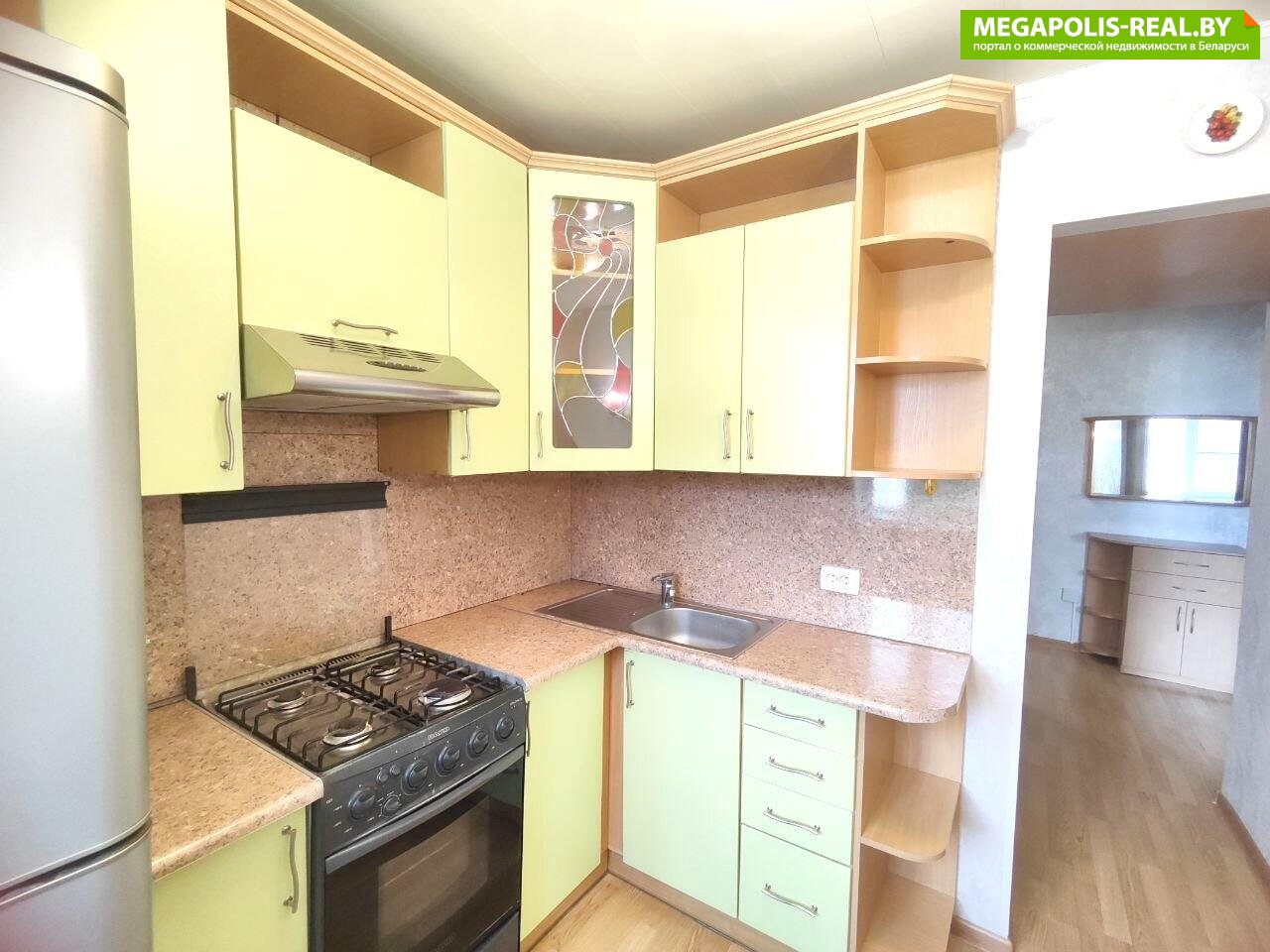Встроенная кухня с бытовой техникой (газовая плита, вытяжка, холодильник).