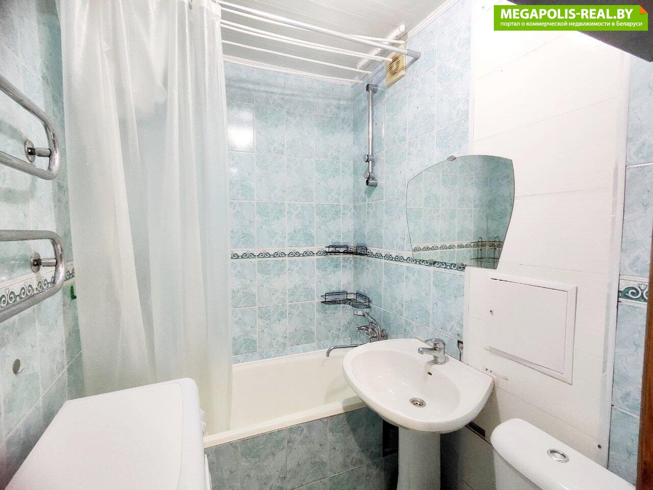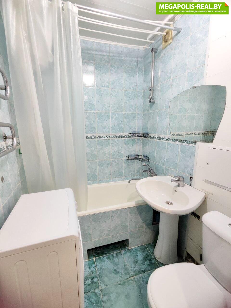 Санузел отделан керамической плиткой, установлена стиральная машина.