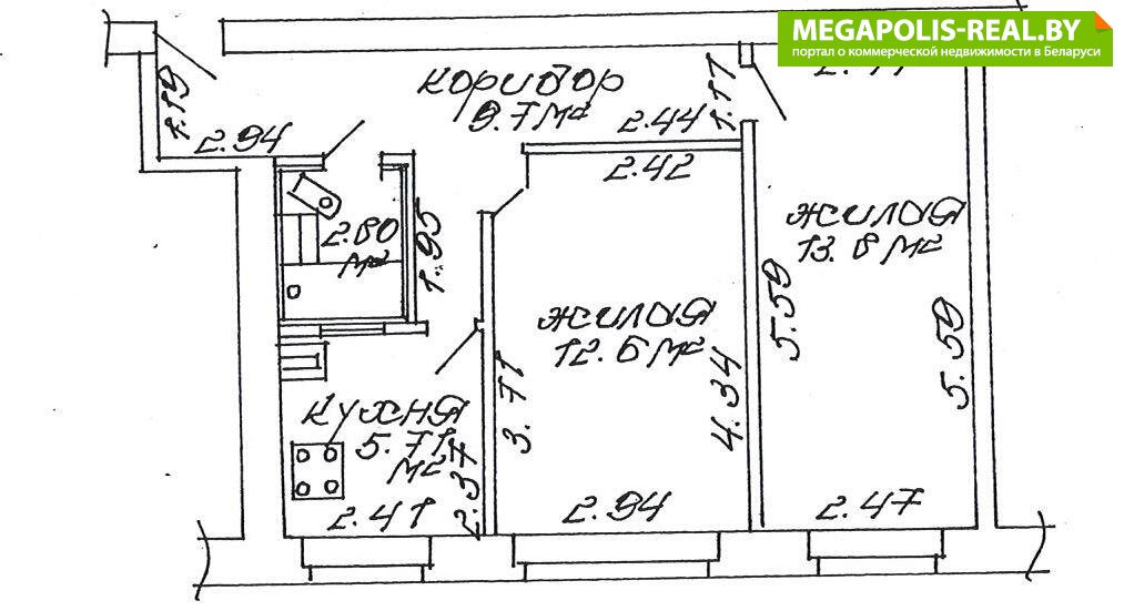 Параметры: 44,61(СНБ)44,61/26,4/5,71 санузел совмещен, прихожая -9,7м, высота потолка-2,5м.