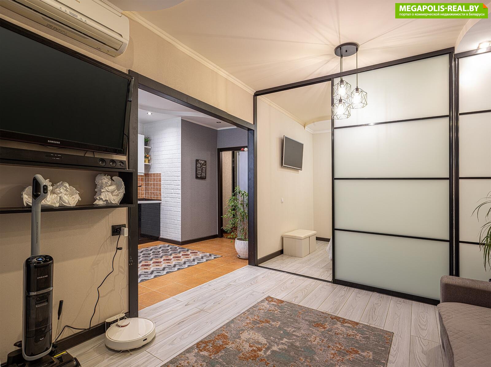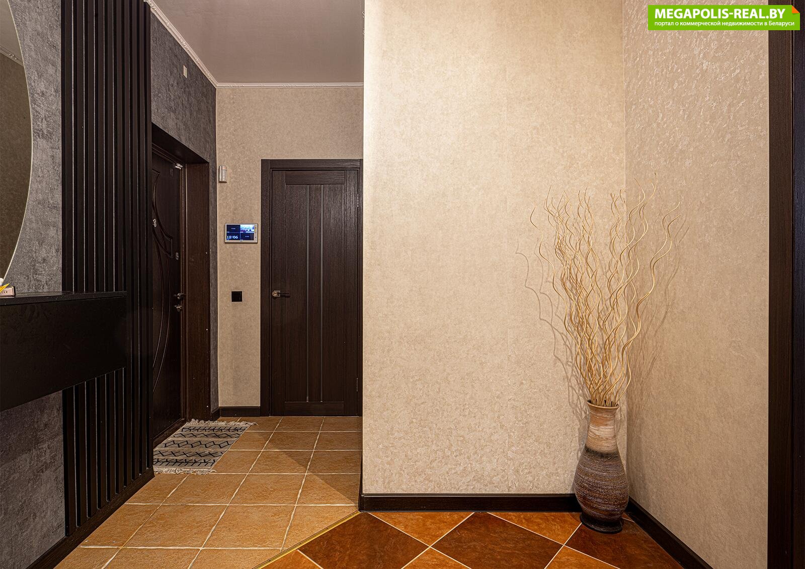 Просторный коридор с глубоким объемным шкафом для хранения и гардеробной около входа. Функционирует видеодомофон с вызывной панелью с камерой, установленной на улице и при входе в квартиру.