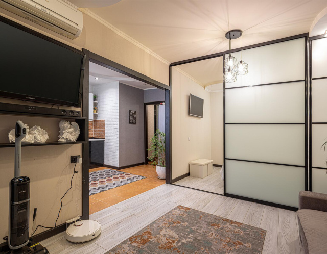 Высота потолков 2.73 метра, раздельные две комнаты и санузел, кухня-гостиная, застекленная лоджия, гардеробная. В квартире сделан свежий ремонт: полностью санузлы, заменены межкомнатные двери с итальянской фурнитурой и переклеены обои в комнатах и коридоре, частично обновлена мебель. Потолки из гипсокартона, в ванной-натяжной. Напольной покрытие плитка – кухня и коридор, в санузлах с подогревом; в комнатах ламинат. Радиаторы отопительные с регулировкой. На всех окнах – шторы и рольшторы. Обслуженный кондиционер премиум класса Mitsubishi. Утепленный фасад снаружи. Два лифта -один из которых грузопассажирский. На этаже, в лифтах и по периметру дома ведется видеонаблюдение. Кухня с встроенной мебелью, посудомоечной машиной Bosch, варочной панелью Ariston, вытяжкой.