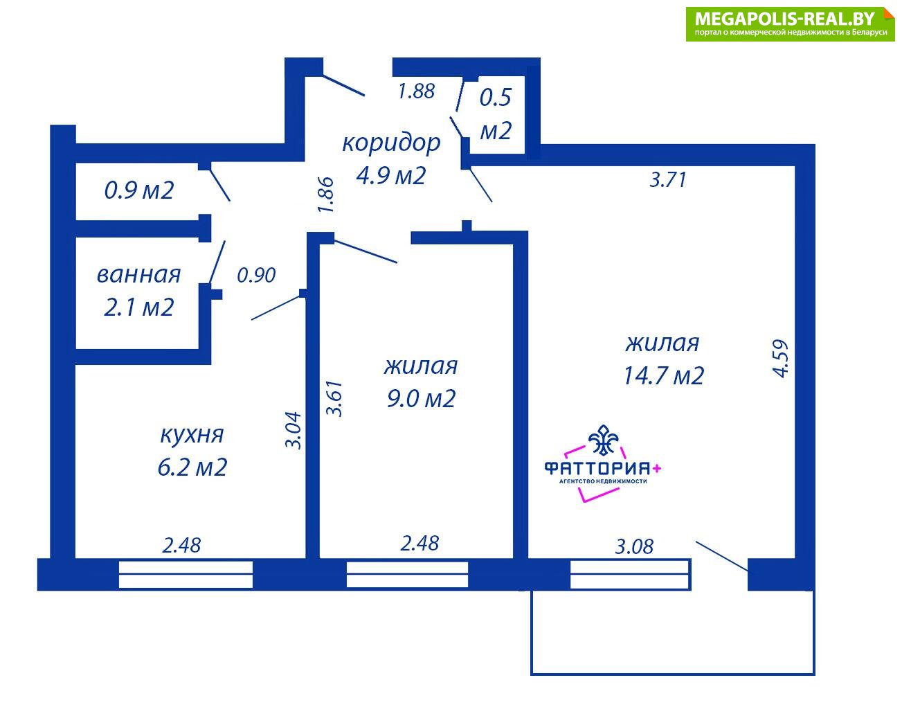 СНБ - 39,2м2 / общая - 38,3м2 / жилая - 23,7м2 / кухня - 6,2 м2