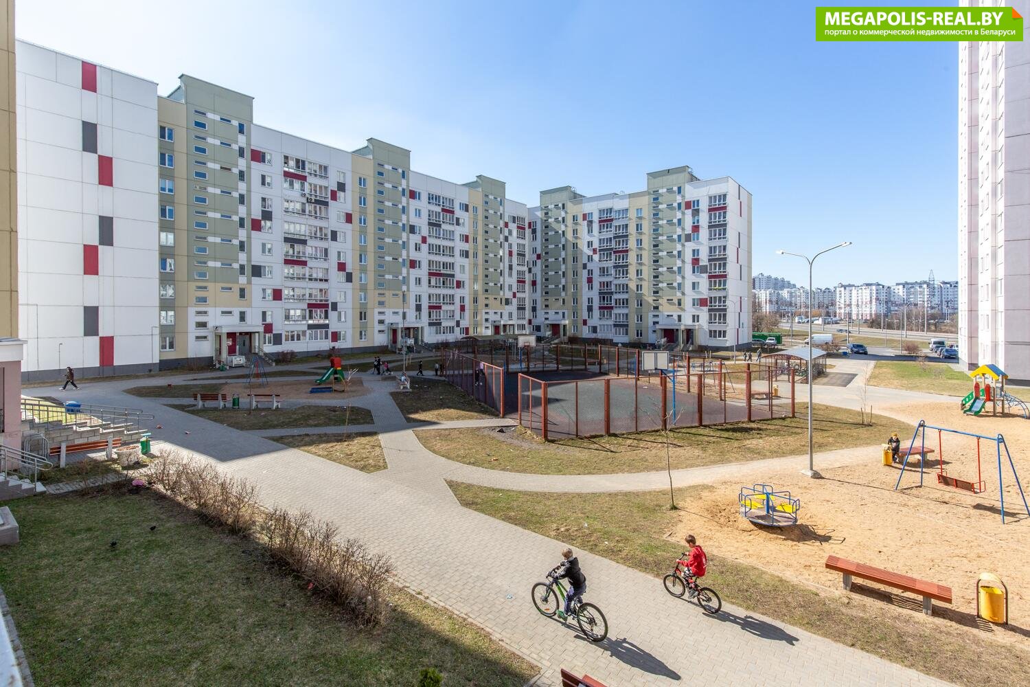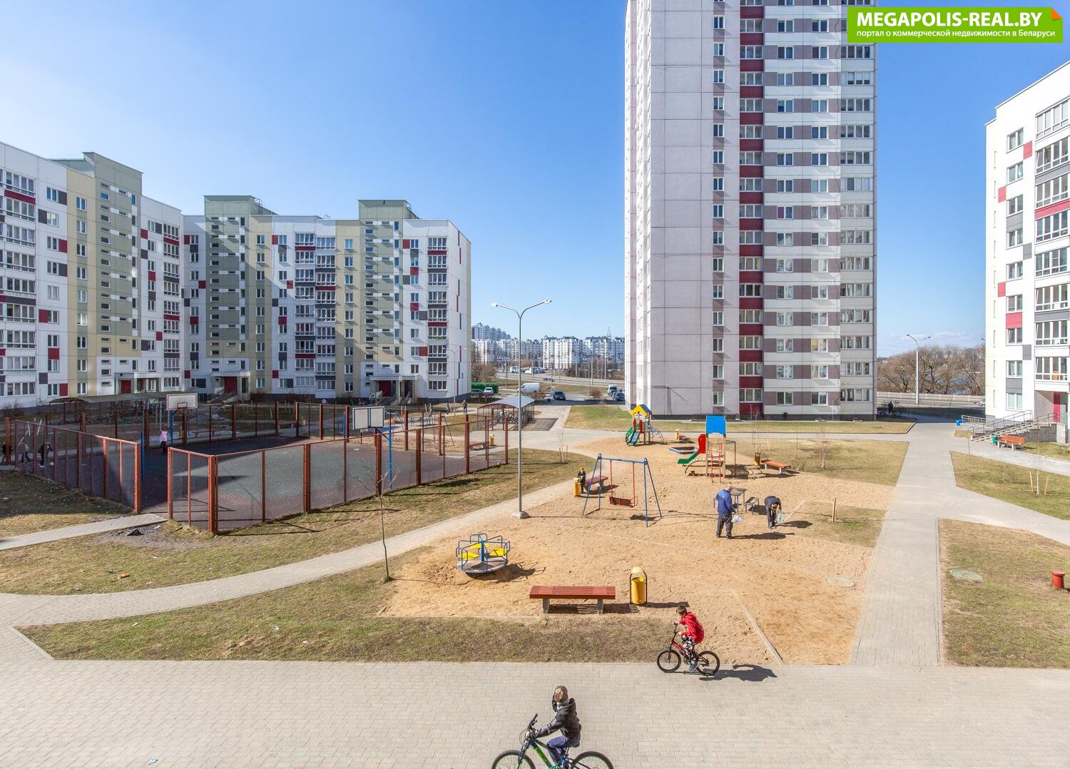 Во дворе много различных детских площадок. Закрытая баскетбольная и футбольная площадки.