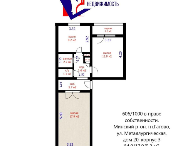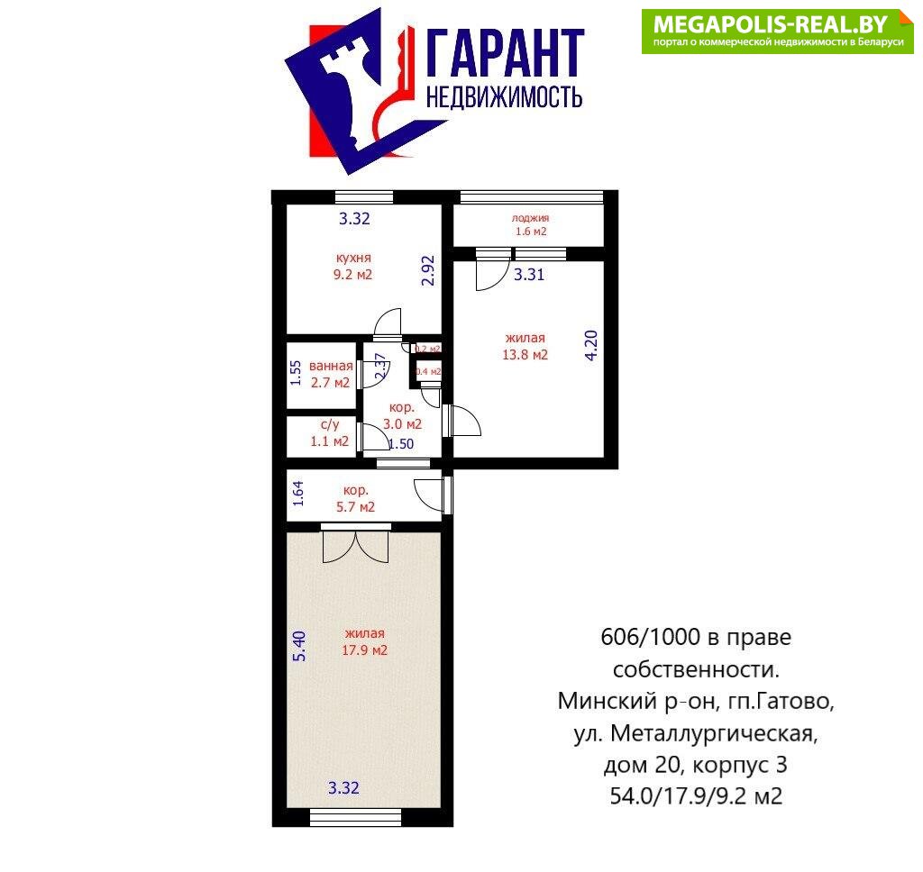 Продается доля в двухкомнатной квартире, состоящая из раздельной комнаты площадью 17.9 м.кв в аг.Гатово, улица Металлургическая, 20, корпус 3. Балкон, лоджия отсутствуют.