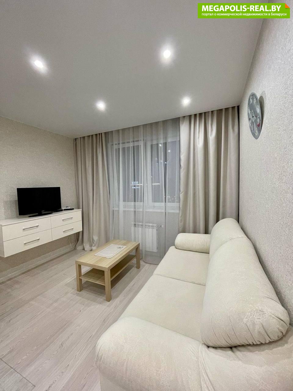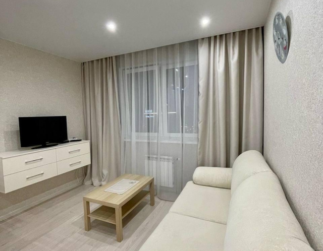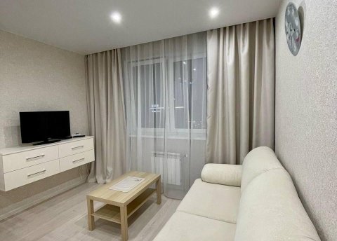 В квартире пространная кухня-гостиная светлая и уютная, с удобным раскладным диваном, зоной ТВ и комодом для хранения.