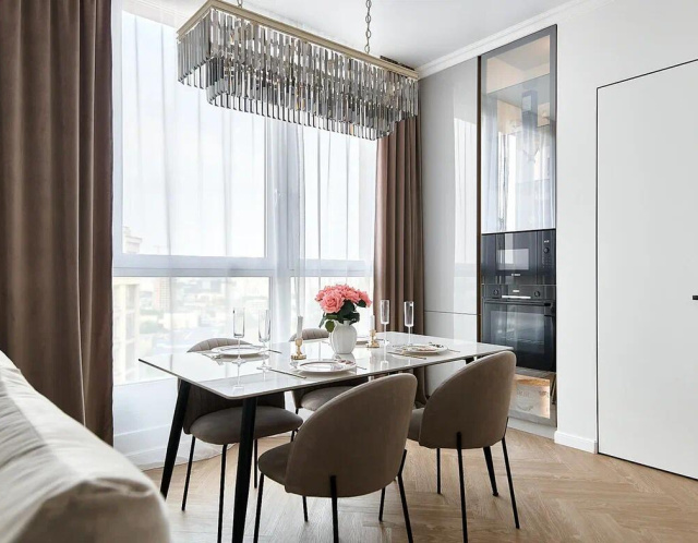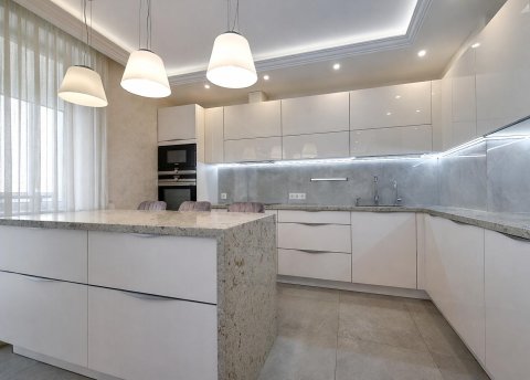 Кухня с крашенными фасадами до самого потолка, полностью оборудована техникой (индукционная варочная поверхность, духовой шкаф, вытяжка, холодильник, посудомоечная машина, измельчитель бытового мусора, фильтр очистки воды).