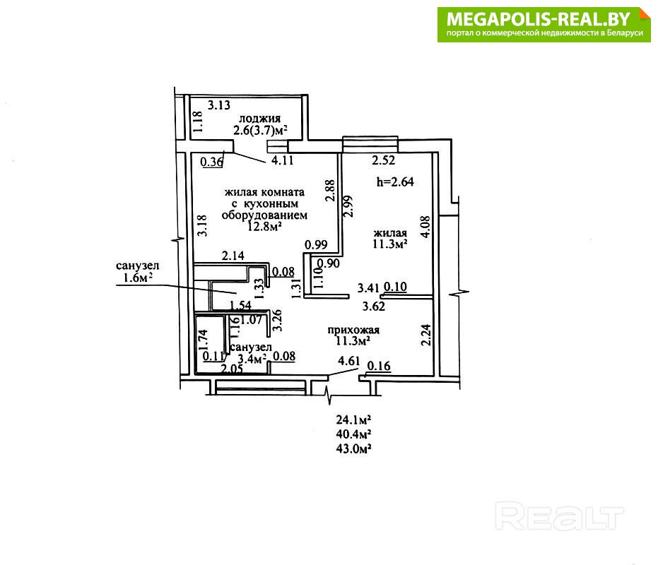 Потолки в квартире 2,64. Общая площадь по СНБ – 43 кв.м.