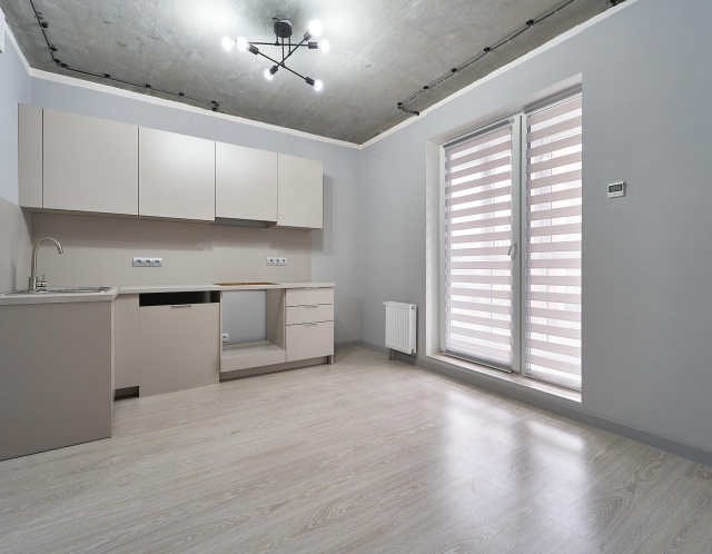 Просторная кухня-гостиная с выходом на лоджию и отдельная спальня с местом для гардеробной. Раздельный санузел.