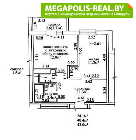 Потолки в квартире 2,64. Общая площадь по СНБ – 43 кв.м.