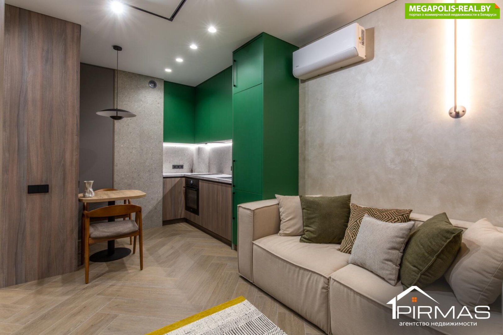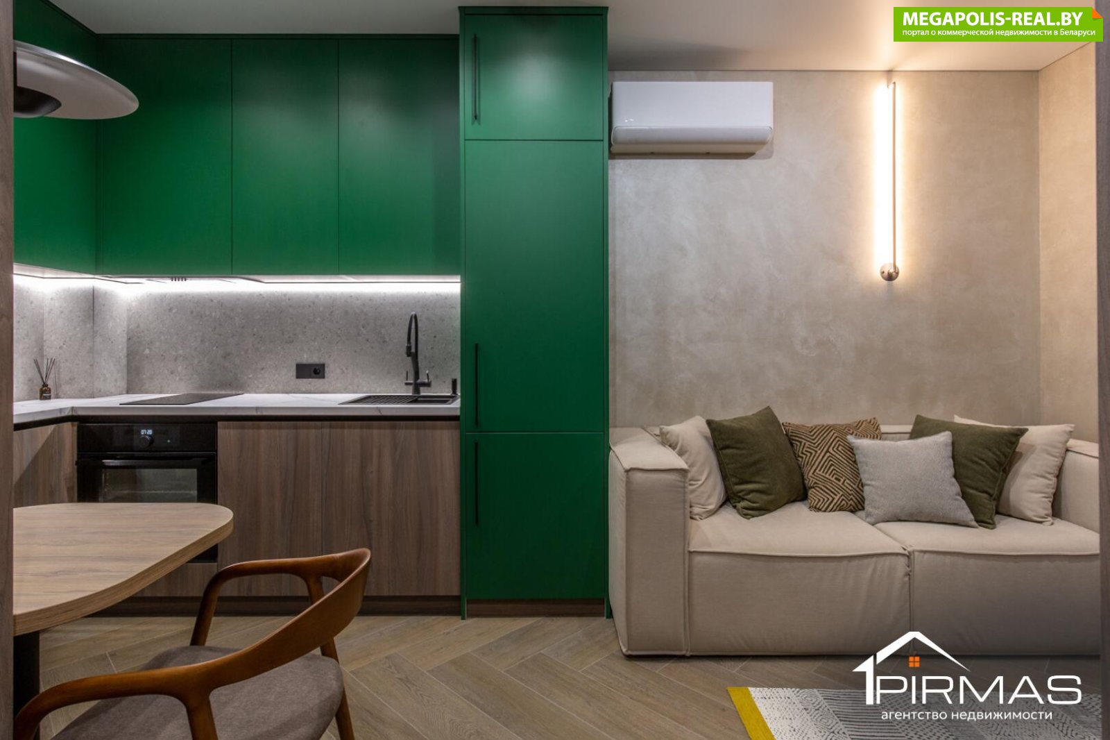 ⭕ Кухня-гостиная Кухонная зона выполнена со встроенной техникой Haier, рабочая поверхность дополнена фартуком и участком стены из керамогранита. Цветовые акценты на фасадах выглядят мягко и гармонично, не перегружая пространство. Обеденная зона логично вписана в общий объём, а зона отдыха с большим комфортным диваном и телевизором LG 55" (модель 2025 года) формирует полноценное место для отдыха и приёма гостей. Установлен кондиционер Midea. Освещение продумано так, чтобы пространство было одинаково удобным и днём, и вечером.