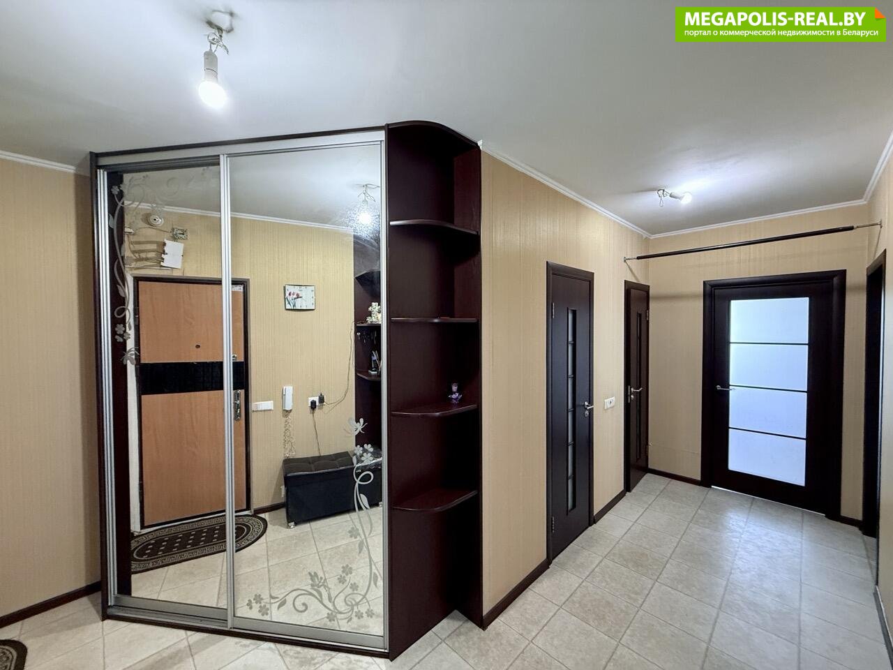 Большая прихожая, в которой есть два вместительных встроенных шкафа купе. Входная дверь металлическая.