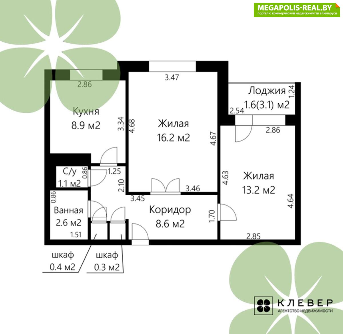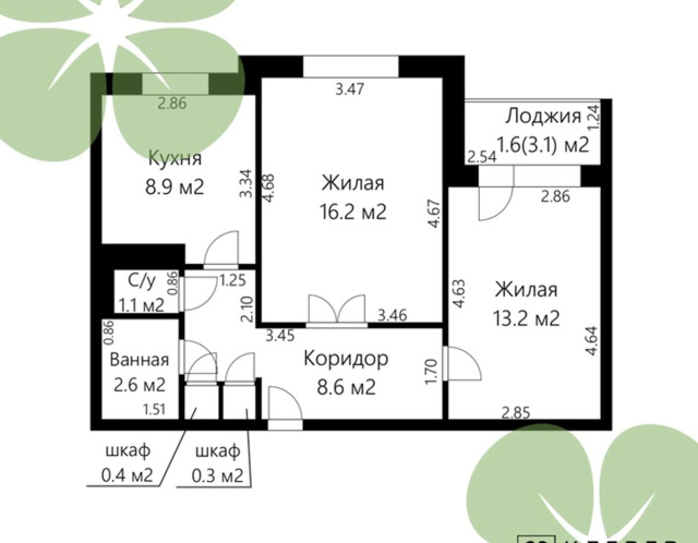 · общая площадь жилых комнат 29,4м2 (16,2 м2 и 13,2 м2)