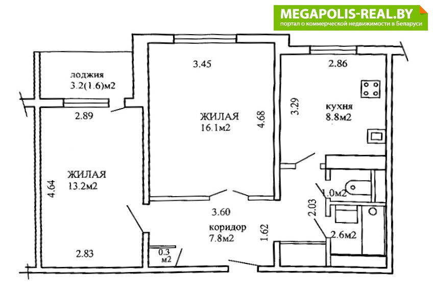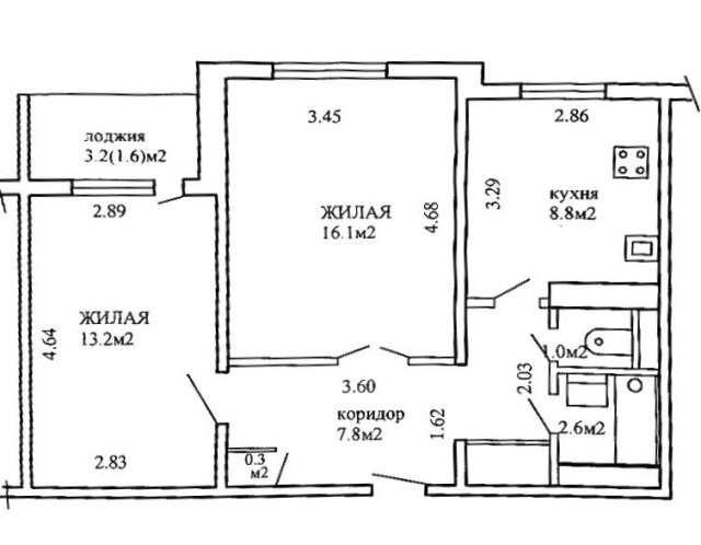 Квартира с улучшенной рациональной планировкой: две раздельные комнаты 13, 2 кв.м с выходом на застекленную лоджию 3.2 кв.м. и 16.1 кв.м, большая кухня 8.8 кв.м., просторный коридор 7.8 кв.м, раздельный санузел.