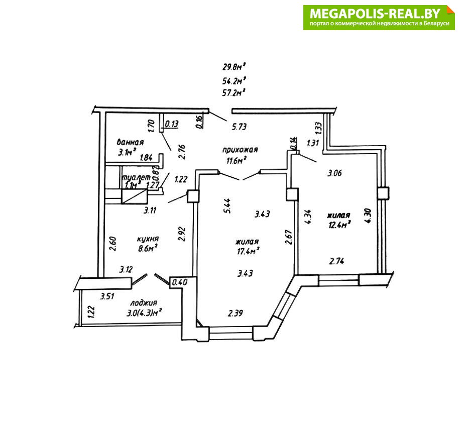 Общая площадь указана по СНБ (с учётом лоджии) - 57.2м2