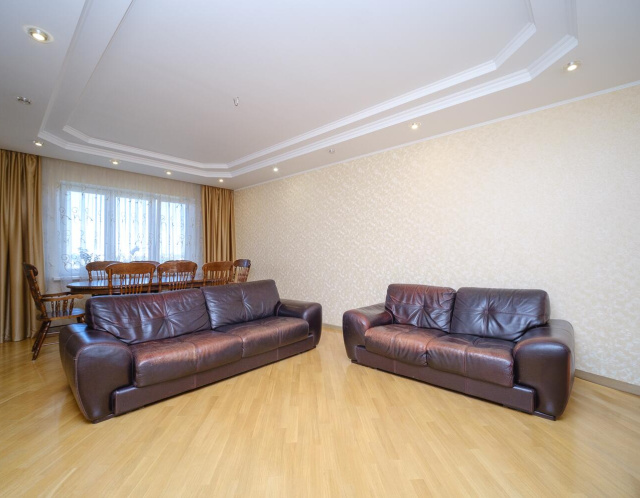 Площадь 68,4 кв.м. по СНБ. Высота потолков-3,03 м. Две раздельные комнаты: 22 кв.м. с лоджией 3,8 кв.м. и 17,8 кв.м. с французским балкончиком. Кухня 10 кв.м., установлена мойка со смесителем и электроплита. Два оборудованных санузла, в каждом установлены унитазы, умывальники со смесителями, в большом санузле ванна. На полу плитка и линолеум, на стенах обои. Качественная металлическая входная дверь. Натяжные матовые потолки.