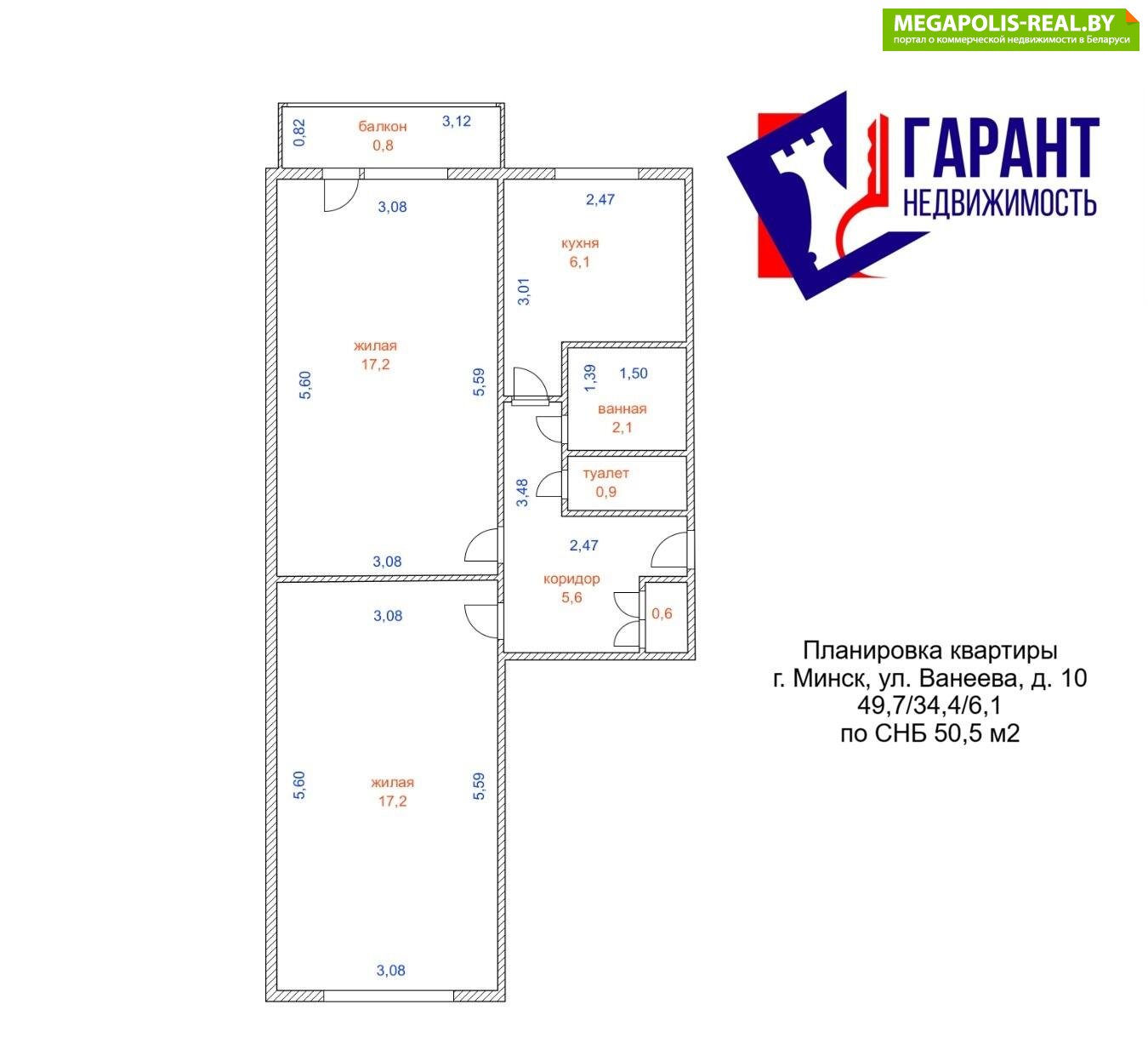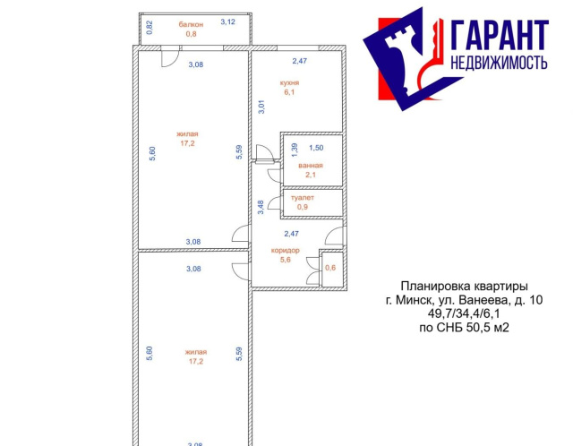 Площадь по СНБ – 50,5 м2, общая – 49,7 м2, жилая – 34,4 м2, кухня – 6,1 м2, 2 большие комнаты по 17,2 м2, раздельный санузел. Имеется подвальное помещение 4 м2.