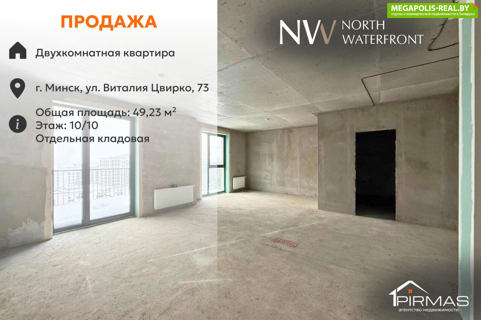 ⭕ Характеристики квартиры► двухкомнатная квартира евроформата;► общая площадь — 49,23 кв.м;► жилая площадь — 43,56 кв.м;► санузел совмещённый;► балкон — 4,74 кв.м (1,42 кв.м по СНБ);► этаж — 10 из 10;► свободная планировка;► квартира очень светлая;► кладовая (3,3 кв.м) в цокольном этаже;► новостройка с черновой отделкой;► частично разведена электрика;► стены оштукатурены;► выполнена ровная стяжка пола;► установлена качественная входная дверь;► приёмка квартиры проводилась с привлечением специалистов, все выявленные дефекты устранены.