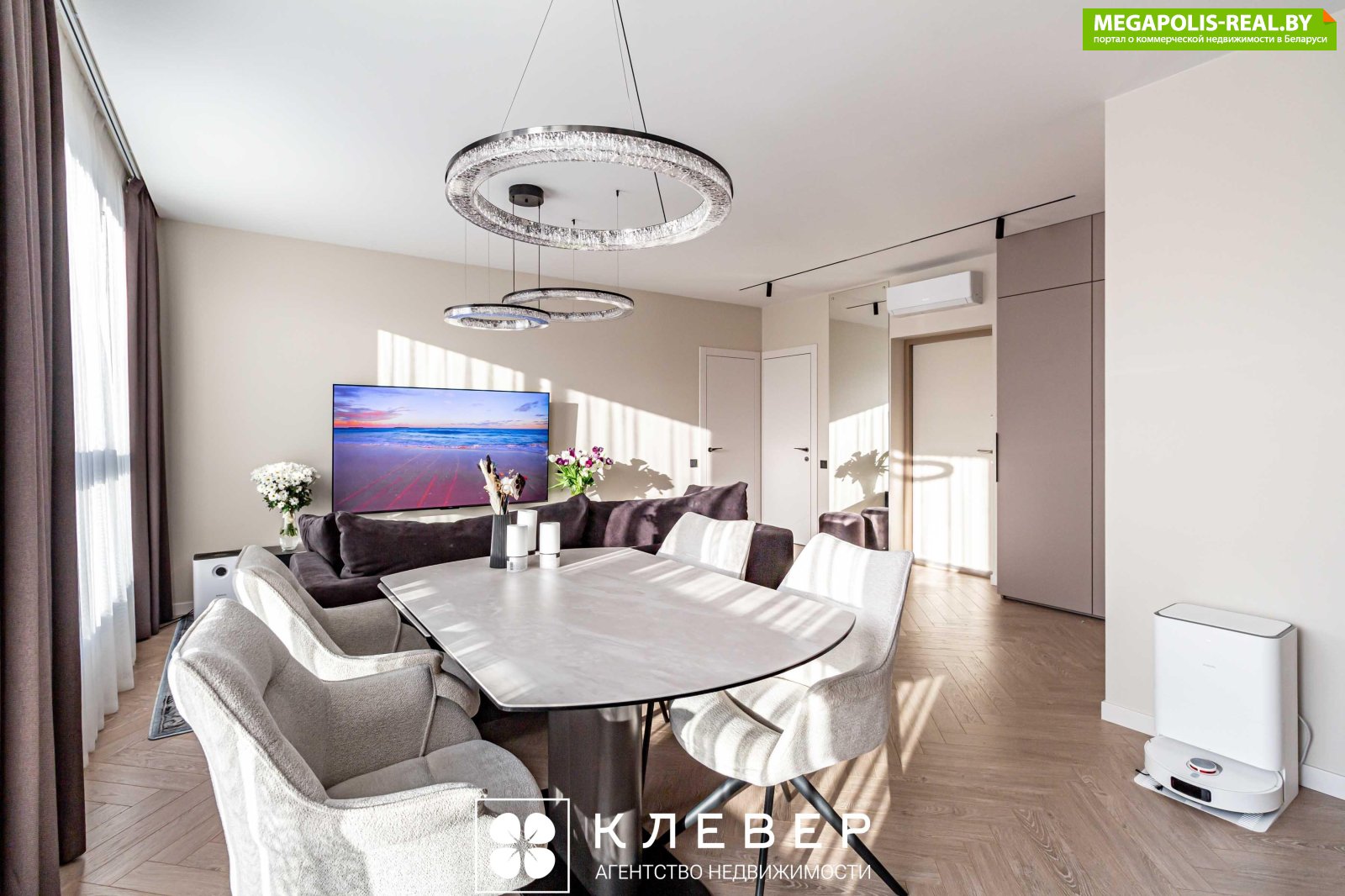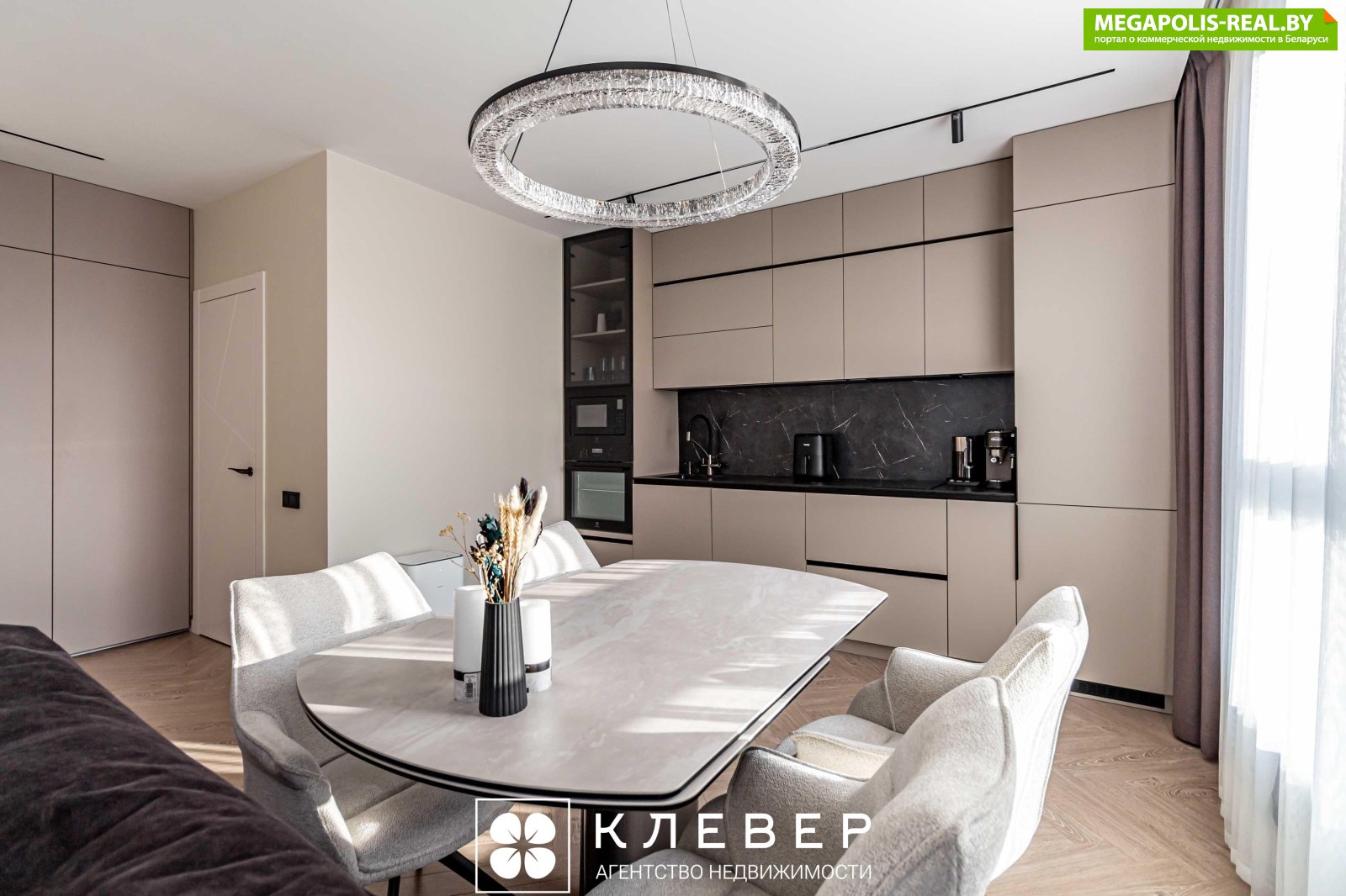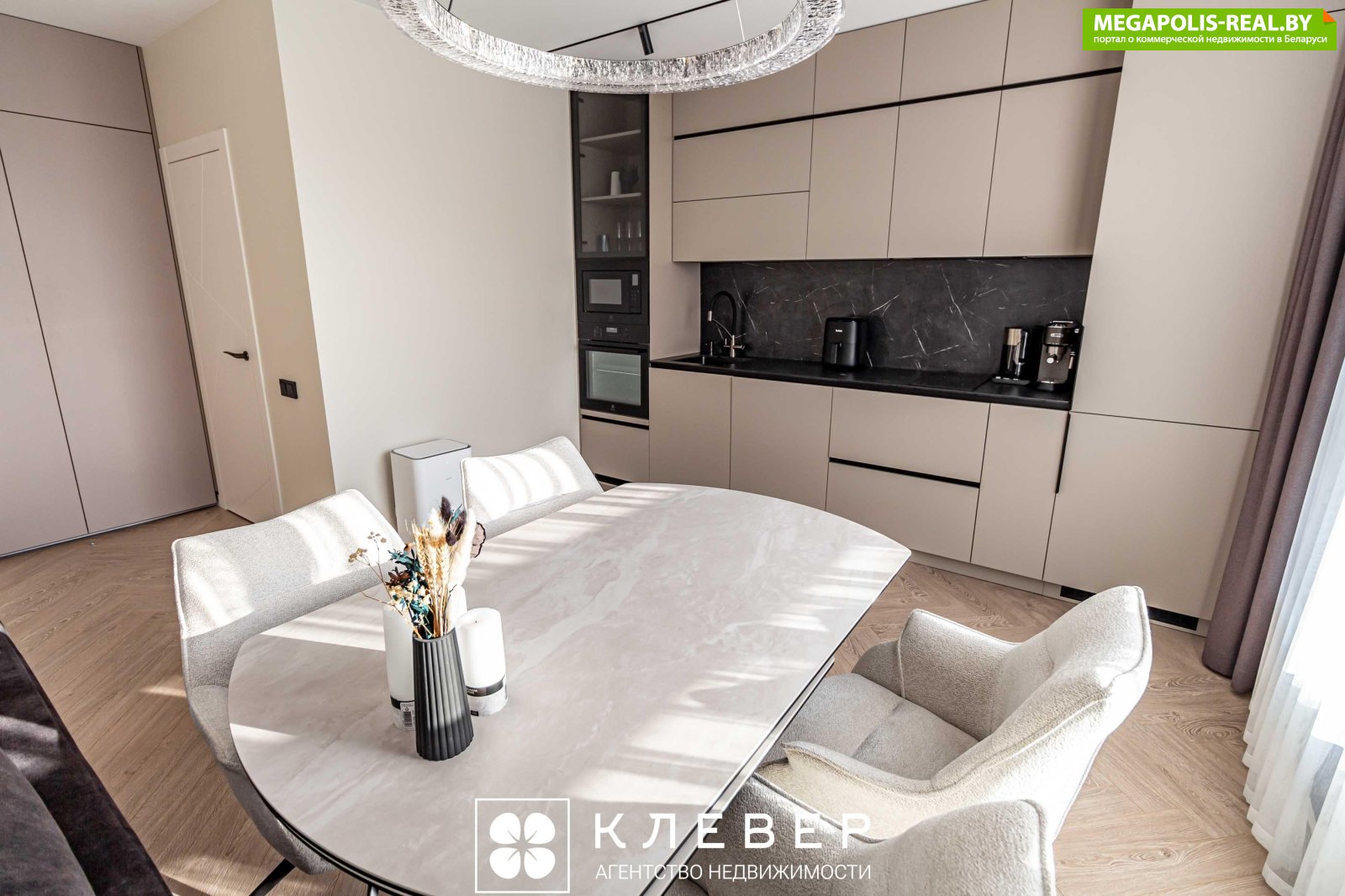 Столовая зона состоит из полноразмерного (раскладного) стола с керамогранитной столешницей и 4 комфортных стульев-кресел с подвижным сиденьем (вращающихся вокруг своей оси) - удобная функция, чтобы не двигать постоянно стулья.