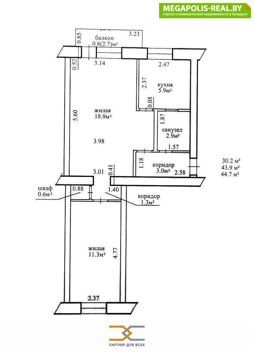 Продается 2-комнатная квартира в г. Минске, по ул. Волоха, 59. Площадь квартиры по СНБ 44.7 м.кв, жилые комнаты 18.9 м.кв. и 11.3 м.кв., кухня 5.9 м.кв.