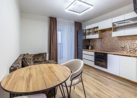 Строительная отделка выполнена в объеме: стяжка пола, штукатурка стен, разводка электрики и отопления, установлены двухкамерные окна ПВХ, лоджия застеклена. Просторный подъезд, есть помещение для консьержа, установлен современный лифт, видеонаблюдение. Выход из подъезда на две стороны. Просторный благоустроенный двор. Новая детская площадка, есть бокс для велосипедов.