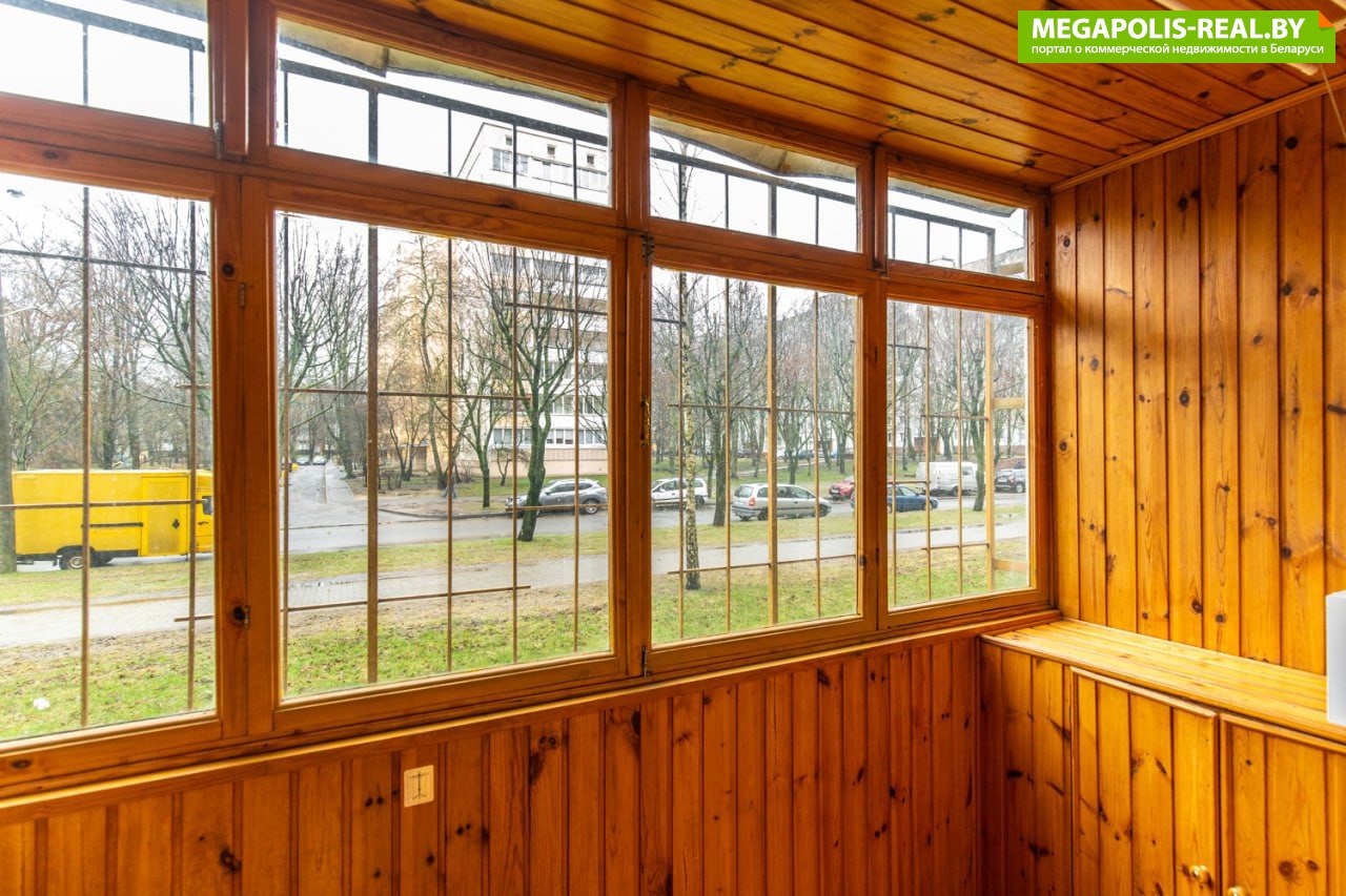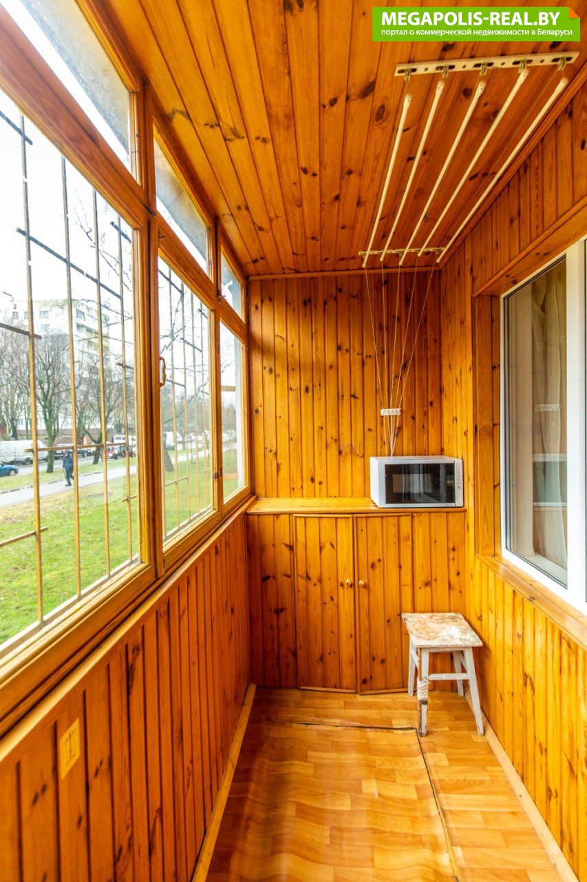 Лоджия застеклена и отделана вагонкой, что делает ее уютной. Дополнительным бонусом является наличие подвала под лоджией, что позволяет хранить резину, закатки и прочее.