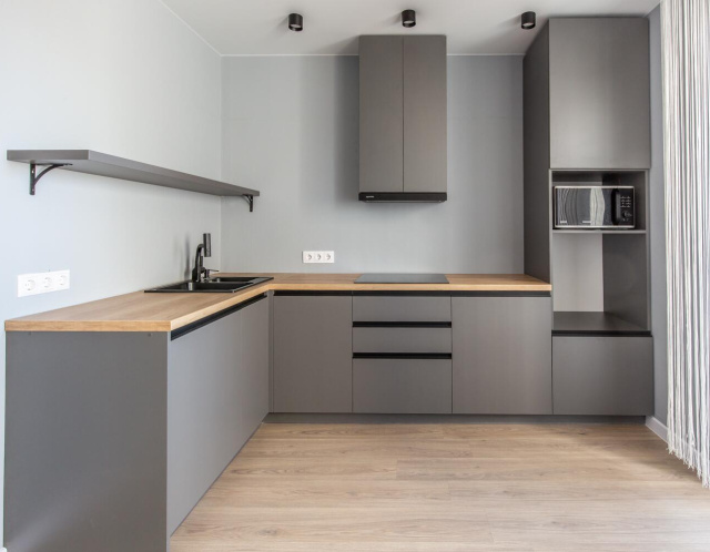 В квартире сделан современный ремонт, установлена встроенная кухня с бытовой техникой, натяжные потолки, на полу уложен ламинат.