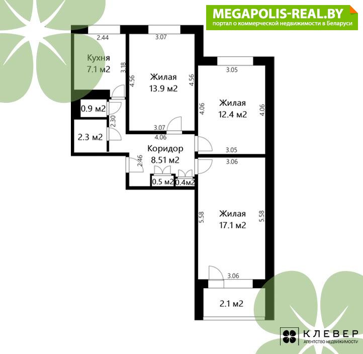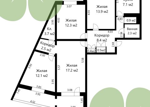 - Жилые комнаты: 17,1, 13,9 и 12,4 кв.м.
