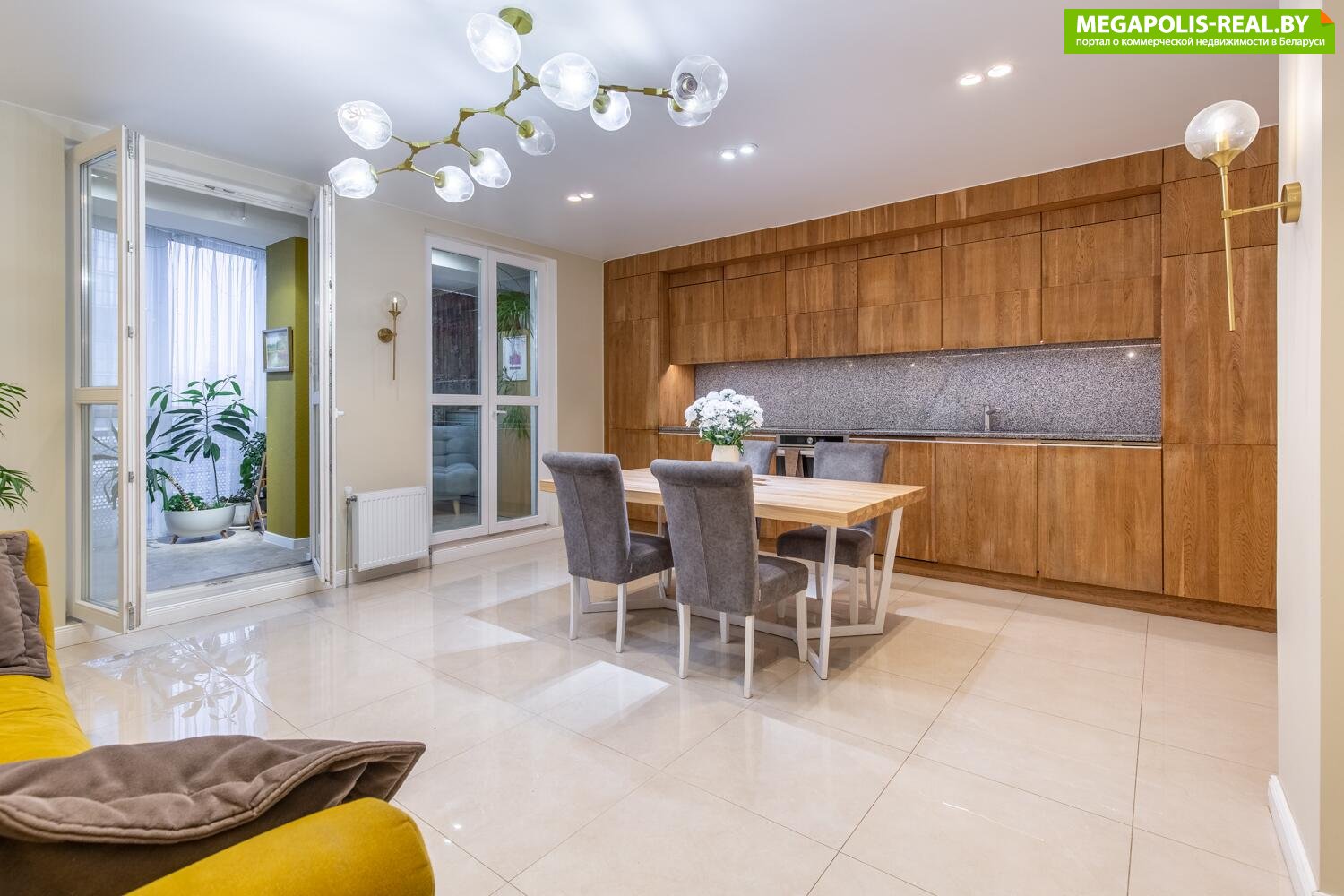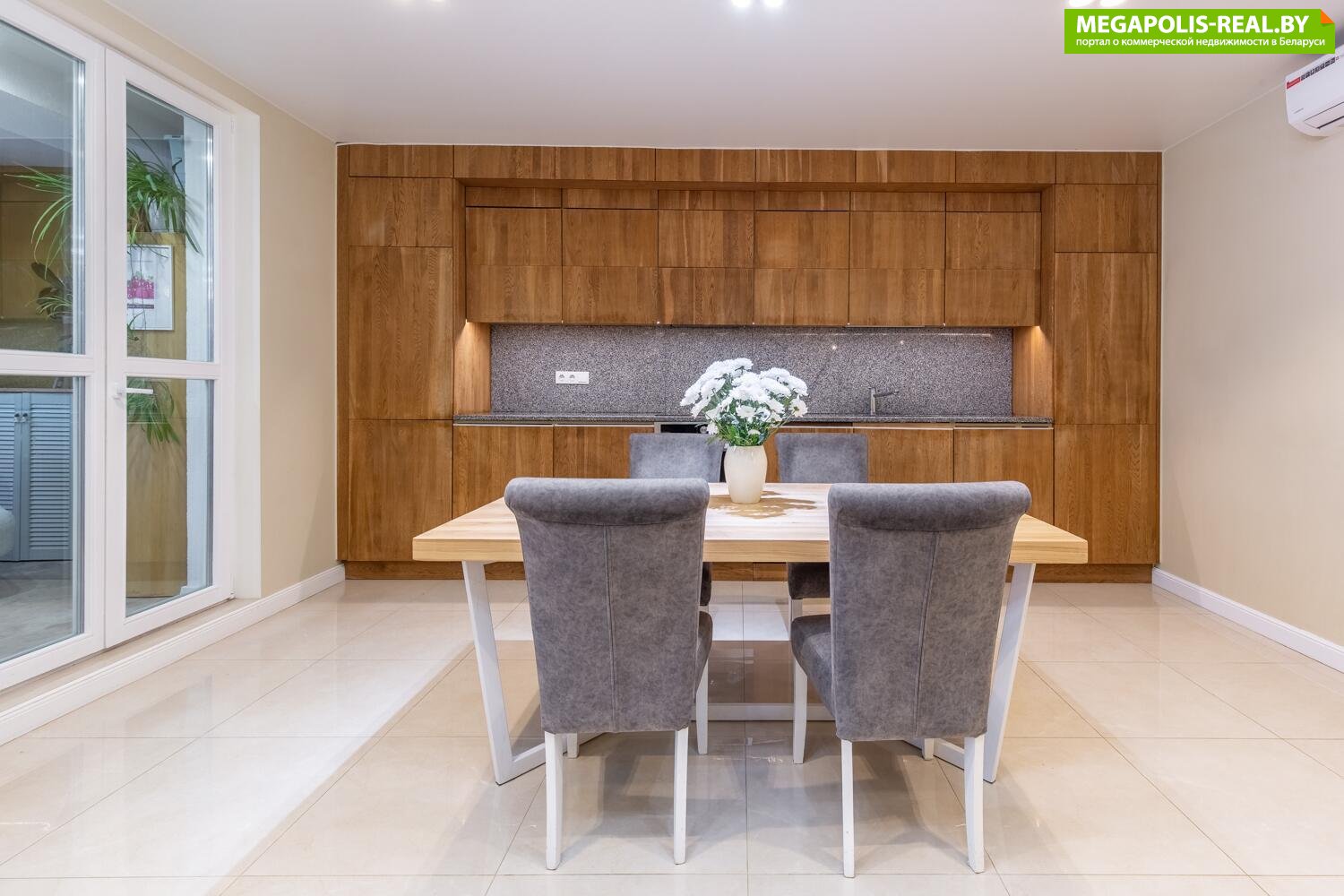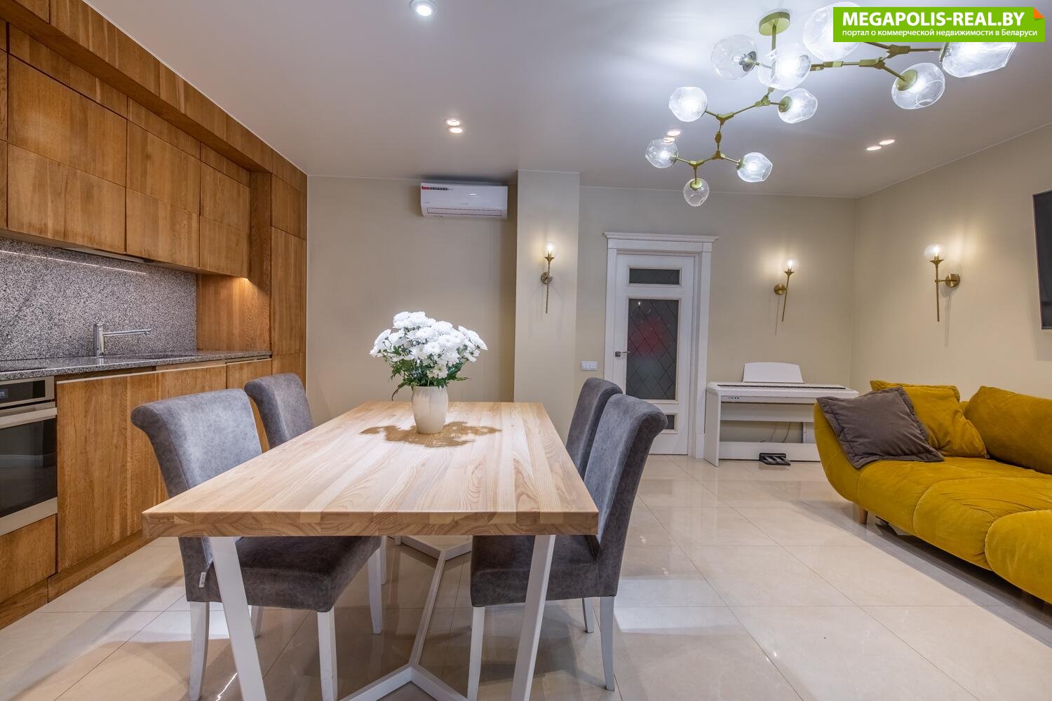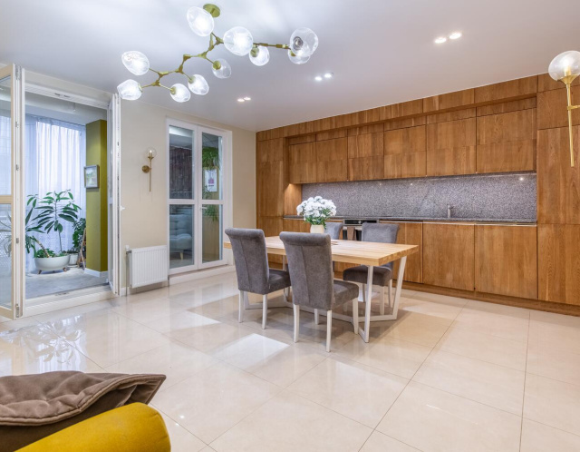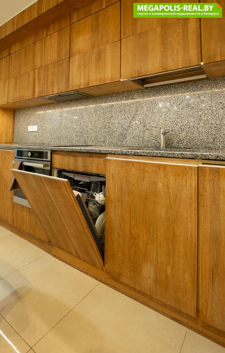 Кухня-гостиная имеет практически квадратную форму. Кухня выполнена из массива дуба покрытая маслом. Рабочая поверхность и скинали выполнены из натурального гранита.