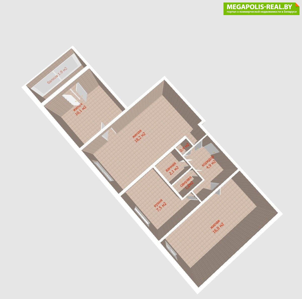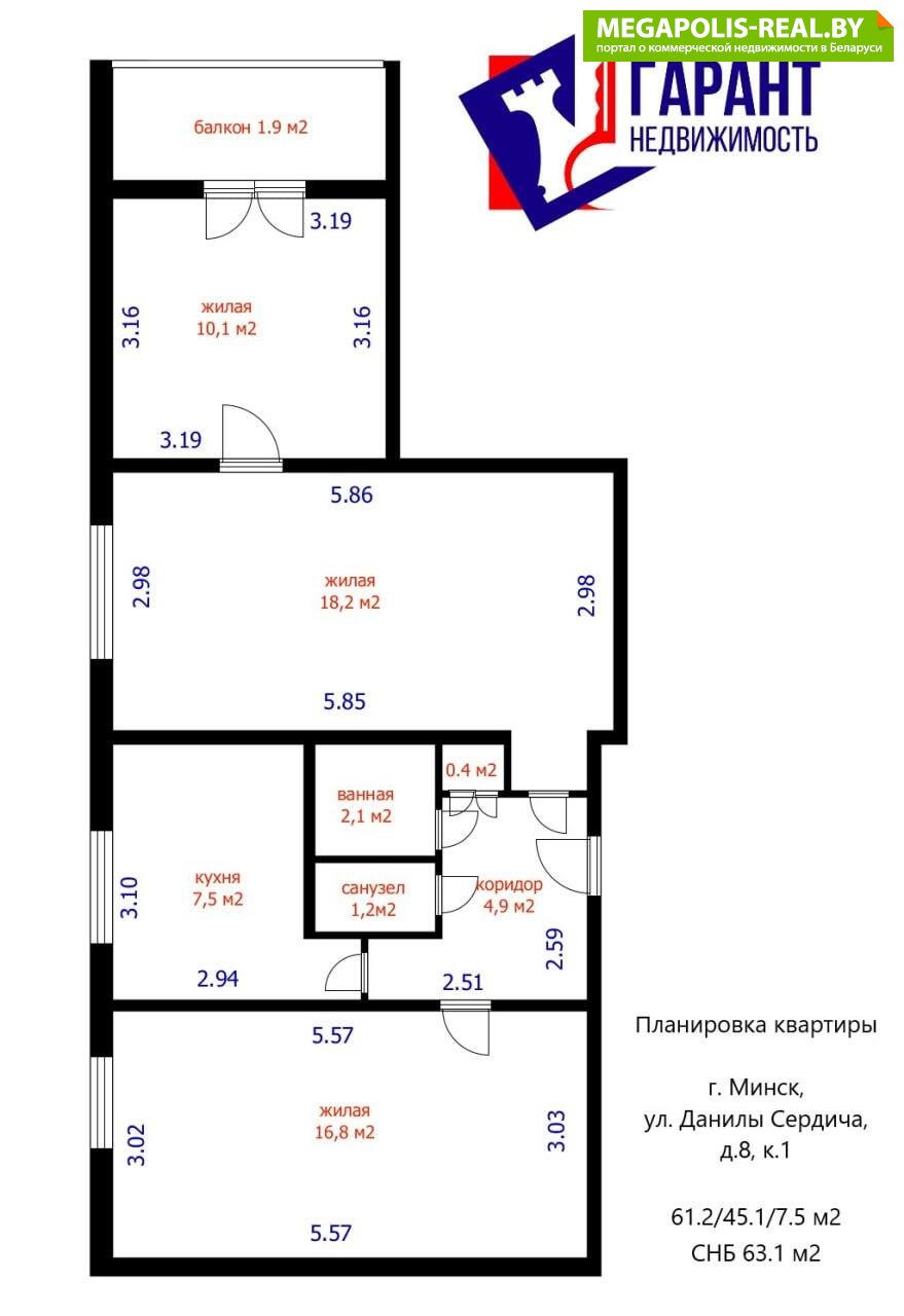 · Площадь: общая 61.2 кв.м (жилая 45.1 кв.м), кухня 7.5 кв.м., (площадь 63,1 по СНБ)
