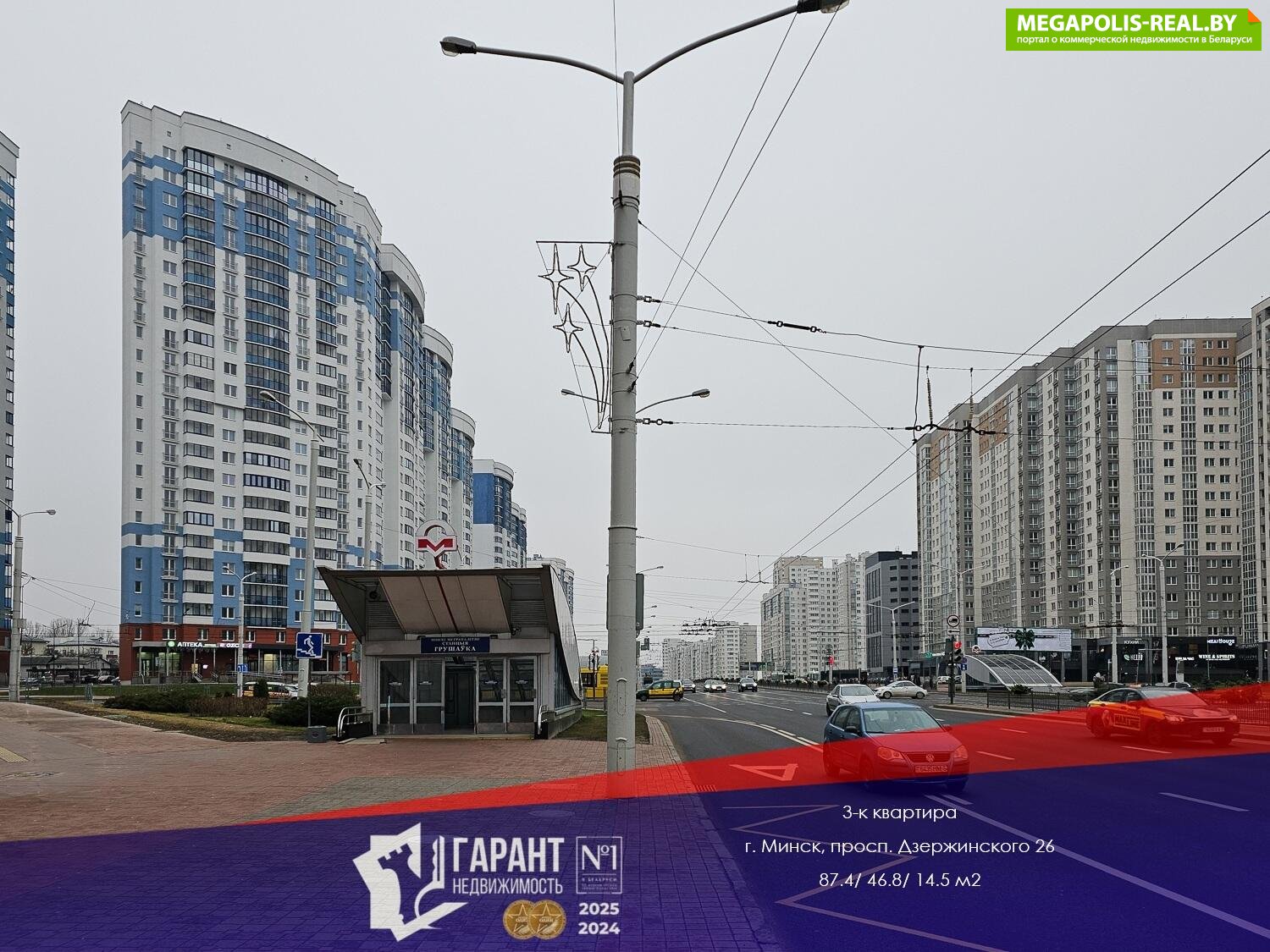 Лучший вариант для семьи!Доступна к покупке просторная и светлая 3-х комнатная квартира в каркасно-блочном доме в центре Минска около станции метро «Грушевка» по адресу пр-т Дзержинского, 26, площадью 87.4 кв.м. с тремя изолированными комнатами на две стороны, большой кухней 14.5 кв.м. и двумя санузлами.Квартира расположена на 9 комфортном этаже с прекрасным панорамным видом на две стороны (одна комната – на пр-т Дзержинского, остальные комнаты, лоджия и кухня – на тихий двор).Дом каркасно-блочный 2023 г.п.В доме 4 бесшумных лифта (2 лифта грузовых, 2 – пассажирских).Площадь по СНБ – 87.4 кв.м.Общая площадь – 83.8 кв.м.Жилая площадь – 46.8 кв.м.Кухня – 14.5 кв.м.Квартира с удобной планировкой, комнаты имеют правильную форму. Площадь жилых комнат 16.3 кв.м., 16.1 кв.м., 14.4 кв.м.Наблюдать за жизнью мегаполиса и любоваться прекрасным видом на проспект можно из жилой комнаты, окна которой выходят на противоположную сторону относительно других.В гостиной панорамные окна выходят на широкую лоджию, площадью 5,1 кв.м., и добавляют помещению больше естественного света, визуально расширяют пространство, делая будущий интерьер светлее и просторнее.В квартире два просторных санузла. Один 4.8 кв.м. – совмещённый, второй 6.2 кв.м.– раздельный, в котором можно организовать современную постирочную комнату со стиральной и сушильной машиной либо поставить душевую кабину.В квартире выполнена строительная отделка, разведена электрика, проложен оптоволоконный кабель.Установлены качественные стеклопакеты, не требующие замены.