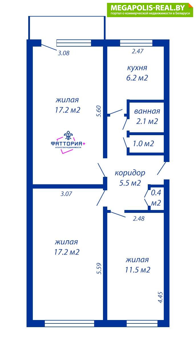 - Количество комнат: трехкомнатная