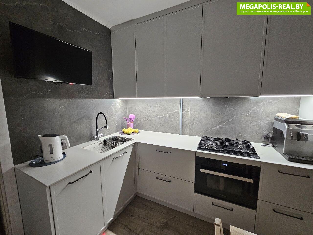 Имеется вся необходимая мебель и техника. Кухня оснащена системой BLUM, оборудована газовой варочной поверхностью, духовым шкафом с функцией микроволновой печи, посудомоечной машиной, холодильником. Полы – ламинат, в санузле – плитка.