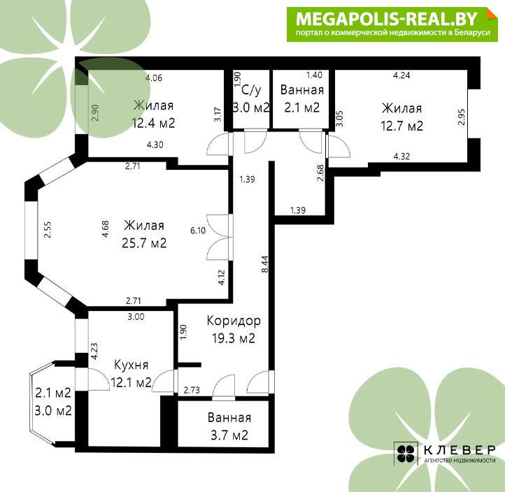 · три отдельные спальни 25.7 м2 и 12.4 м2, 12,7