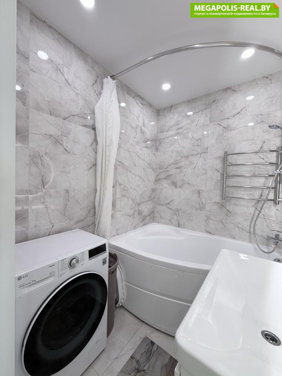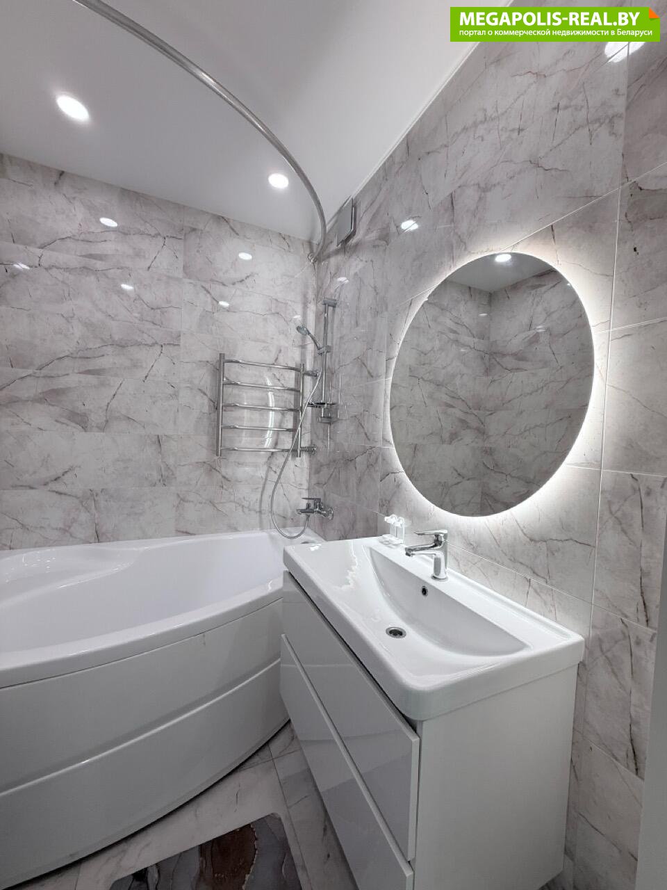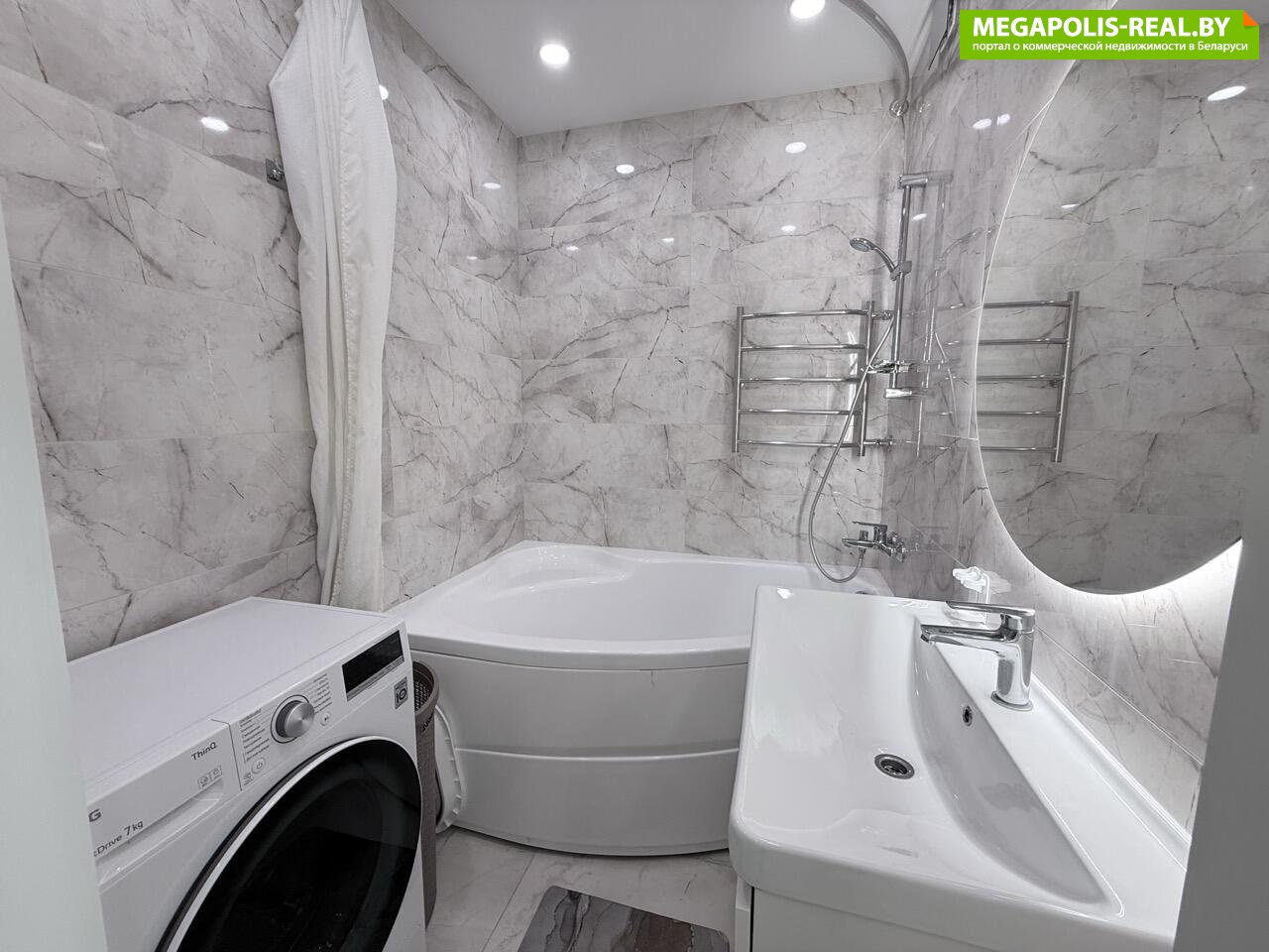 Ванна и санузел облицованы современной плиткой под мрамор. Установлена угловая ванна. Сантехника хороших брендов. Инсталляция и подвесной унитаз в санузле. Также, в санузле есть второй умывальник со шкафчиком, что очень удобно.
