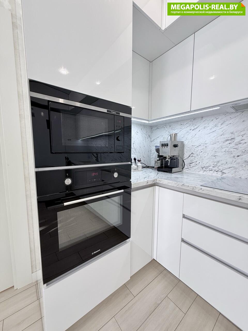 Встроенная кухня до потолка-мест хранения хватит для всего. Шкафчики на качественных доводчиках. Техника вся встроенная и именитых производителей.