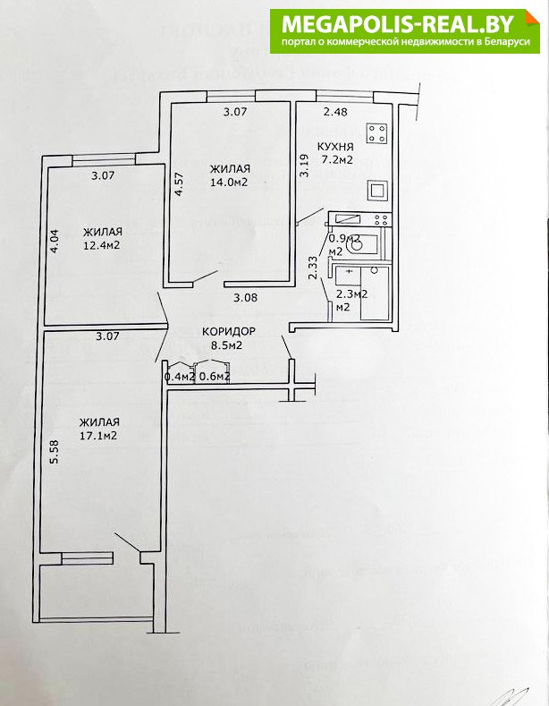 В квартире просторная прихожая, в которой расположена зона хранения обуви и других принадлежностей. 3 полноценные раздельные комнаты площадью (12,4; 14; 17,1 кв.м.). Раздельный санузел. Входная металлическая дверь. Квартира пригодна для жизни.