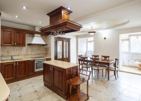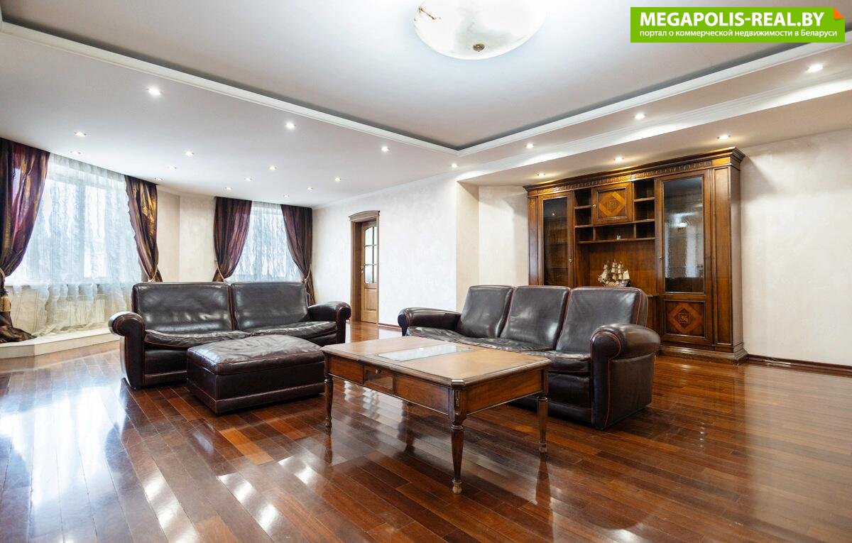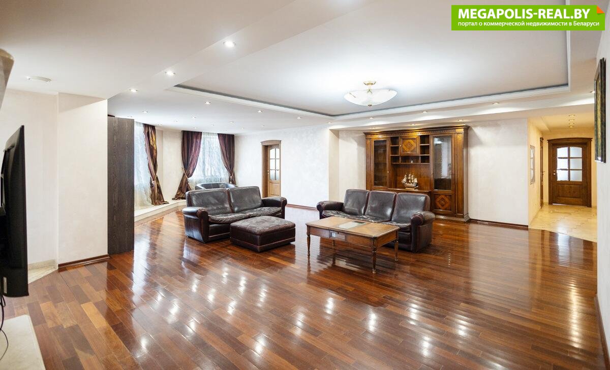 • Гостиная, кабинет и спальня: Пол выложен натуральным штучным паркетом из мербау с благородным лаковым блеском. Мебель — исключительно итальянская, из массива темного ореха. Межкомнатные двери выполнены из массива со вставками из матового стекла (сатинат).